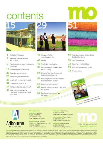 DISCLAIMER Adbourne Publishing cannot ensure that the advertisers appearing in The Motel Owners Journal comply absolutely with the Trades Practices Act and other consumer legislation. The responsibility is therefore on the person, company or advertising agency submitting the advertisement(s) for publication. Adbourne Publishing reserves the right to refuse any advertisement without stating the reason. No responsibility is accepted for incorrect information contained in advertisements or editorial. The editor reserves the right to edit, abridge or otherwise alter articles for publication. All original material produced in this magazine remains the property of the publisher and cannot be reproduced without authority. The views of the contributors are not necessarily those of the publisher.