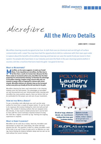icrofibre, as the name suggests, is made up of small fibres. To be classified as a microfibre, the fibre has to be finer than 1/100th of a human hair. Because the fine fibres create an increased surface area, microfibre has the ideal properties for environmental cleaning. To illustrate the advantage of microfibre cleaning, imagine using a broom with only 100 strands to sweep a floor as opposed to a broom with 10000 strands. Microfibre delivers an ultimate clean as the increased surface area picks up virtually all the dirt and dust in its path. Microfibre cleaning has been used extensively in the cleaning industry since the mid-nineties. The advantages of microfibre are well documented and vast. Unfortunately while cleaning with microfibre has many positive aspects, there are factors that can be overlooked for the proper use and care of your investment.