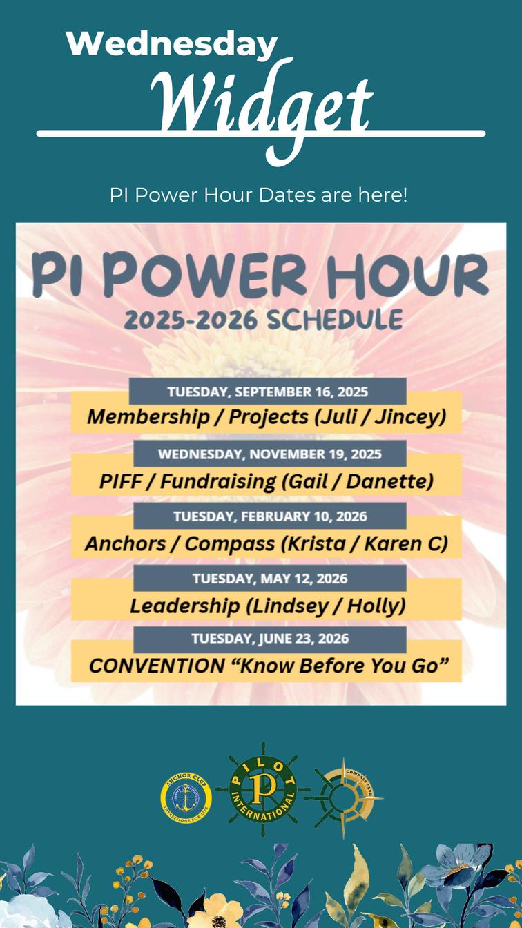 Anchor members are back in school and making their mark in their communities with projects, fundraisers, and mixers. Please support your Anchors and remember that Anchor dues of $10 plus $4 per member insurance (if a US club) are due to Pilot Headquarters on or before NOVEMBER 1st. With dues, please have your Anchor advisors include the invoice, treasurer's report, and officer'sform when remitting. Compass Clubs members are navigating a new course oftraining and expansion. New clubs are blooming, two in our Florida District this quarter, and our Compass membership numbers are steadily increasing. Remember, Compass dues are $10 plus $6 per member insurance (if a US club) for the year 2025-26 and a dueto Pilot International HQ by NOVEMBER1 . st