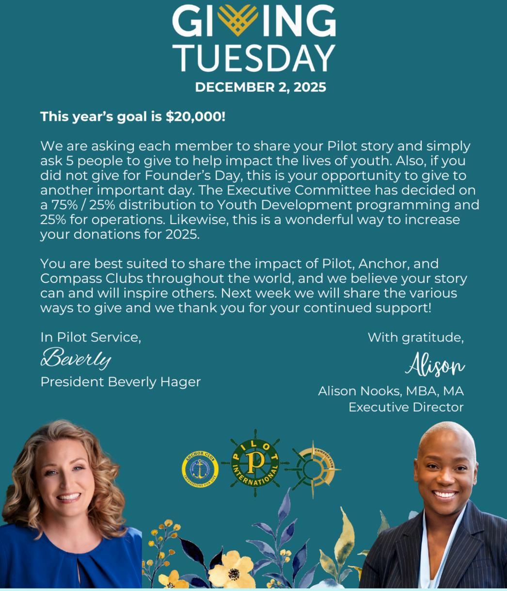 GivingTuesday is all about celebrating every single act of generosity we have to offer. Whether it is making someone smile, helping a neighbor out, or showing upfor people we care about, we each have something to contribute. Identify your gifts, pick a cause that gets you fired up, and give back – not just today but every day! You each are a beautiful flower in the Pilot Bouquet! December 2nd marks a day of giving back. Our GivingTuesday campaign will benefit Youth Programs and Operations. We are confident our 2025 goal of $20,000 will be met this year with your help Be on the lookout for information coming soon from PIHQ