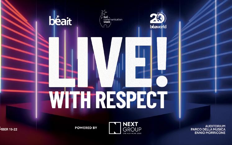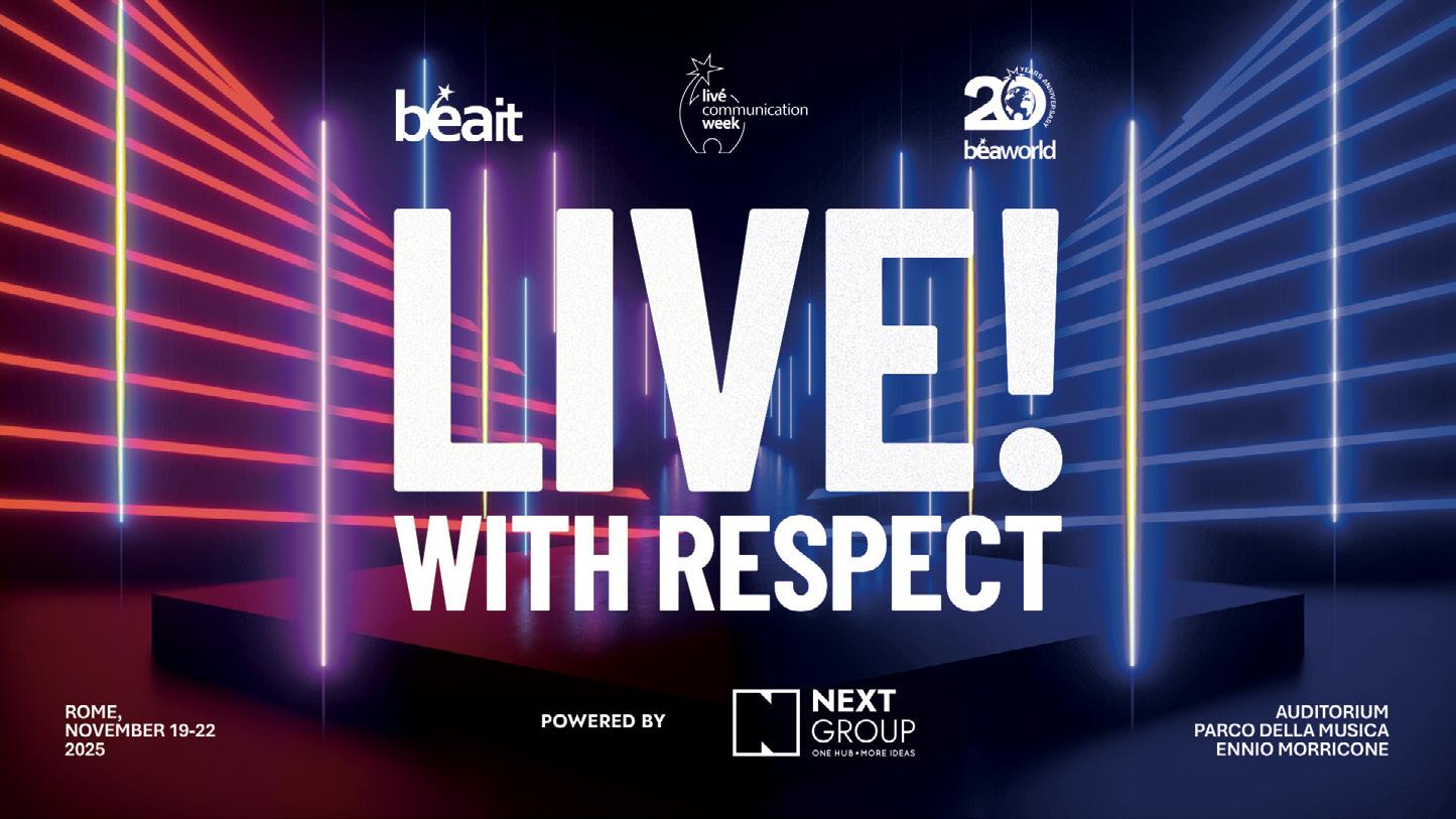 Live! With Respect’ è al tempo stesso una chiamata all’azione per le agenzie e per tutto il settore, perché il rispetto guidi ogni fase del processo creativo e produttivo, e un’esortazione personale a viverlo verso sé stessi e l’ambiente che ci circonda. Il concept mira così a stimolare un cambiamento culturale, creando insieme un nuovo modo di fare eventi e di relazionarsi, attraverso experience coerenti con i propri valori e un networking aperto e costruttivo. Sarà proprio il networking uno dei protagonisti della quinta edizione della settimana dedicata al mondo degli eventi e ai suoi player, che torna per il quarto anno consecutivo nella Capitale. Dal 19 al 22 novembre, quattro giornate di creatività, ispirazione e connessioni accoglieranno oltre 2.000 professionisti della comunicazione e degli eventi da tutto il mondo, protagonisti della più grande kermesse internazionale dedicata alla live communication. I rappresentanti di agenzie e aziende provenienti da 35 Paesi animeranno la 22ª edizione del Bea Italia (19 e 20 novembre), con 317 progetti in gara (+6,2%), e la 20ª edizione del Bea World (21 e 22 novembre), che registra un record con 470 eventi in concorso (+1,5%). Per celebrare il prestigioso anniversario del premio internazionale, sarà realizzato un volume speciale, distribuito in versione cartacea e digitale durante la settimana. A decretare i migliori eventi del globo saranno due giurie, per un totale di circa 100 giurati, tra Bea Italia e Bea World, guidati rispettivamente da Elisa Noaro (Reale Group) e Gonçalo Oliveira (Deloitte). I tre momenti clou dei Festival legati ai premi (giurie con le live presentations, giornate dedicate ai contenuti e Cerimonie) offriranno momenti di riflessione, ispirazione e confronto sull’evoluzione della live communication, con idee, esperienze e nuove interpretazioni.