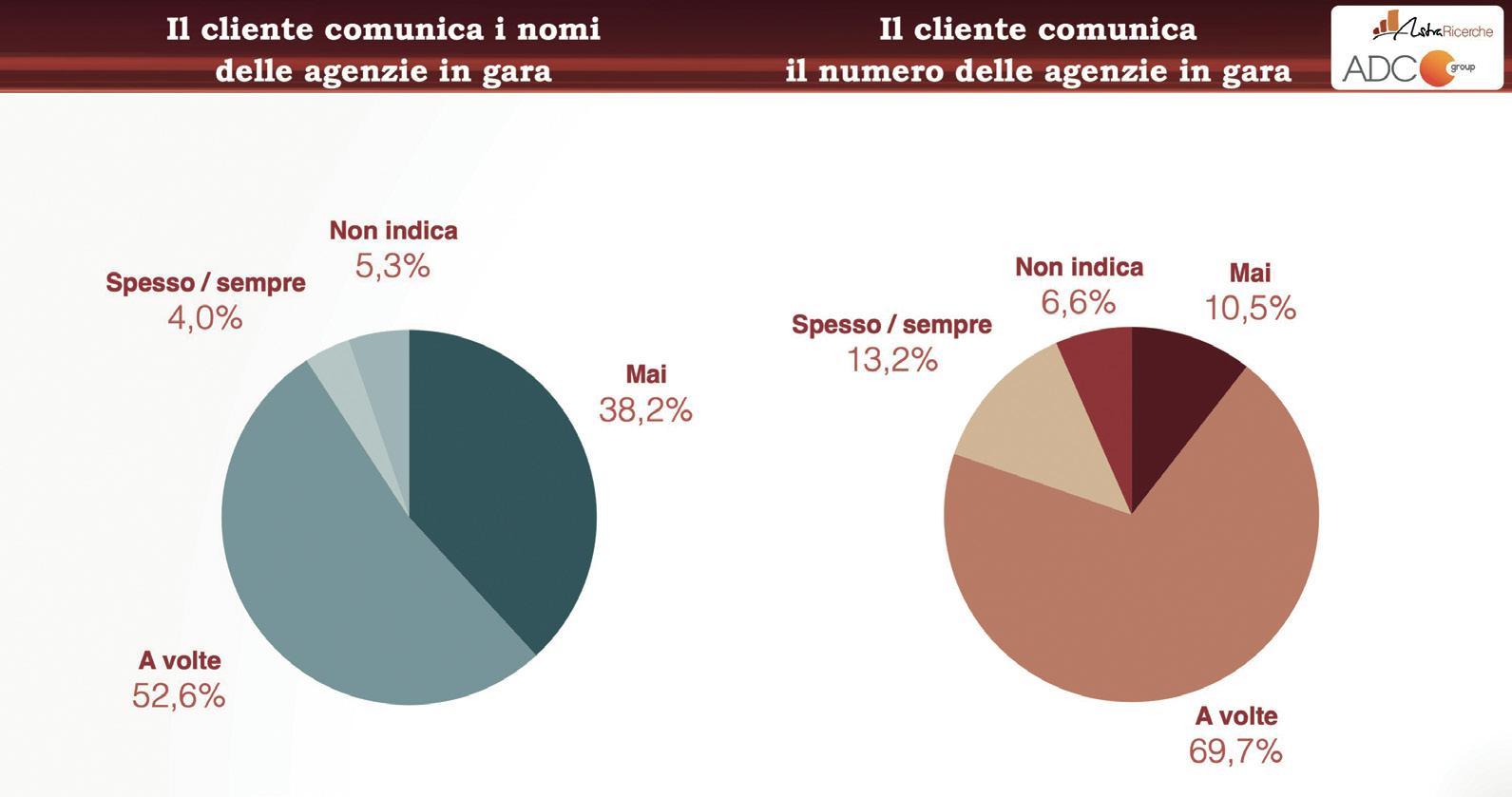 Non solo troppe agenzie, ma anche poca chiarezza. La trasparenza dei clienti sulle gare è tutt’altro che scontata. Ben il 38% dei rispondenti afferma che i clienti non comunicano mai i nomi delle altre agenzie in gara, mentre solo il 4% dice di saperlo sempre. Allo stesso modo, solo il 13% conosce sempre il numero dei partecipanti, contro un 10% che non lo sa mai.