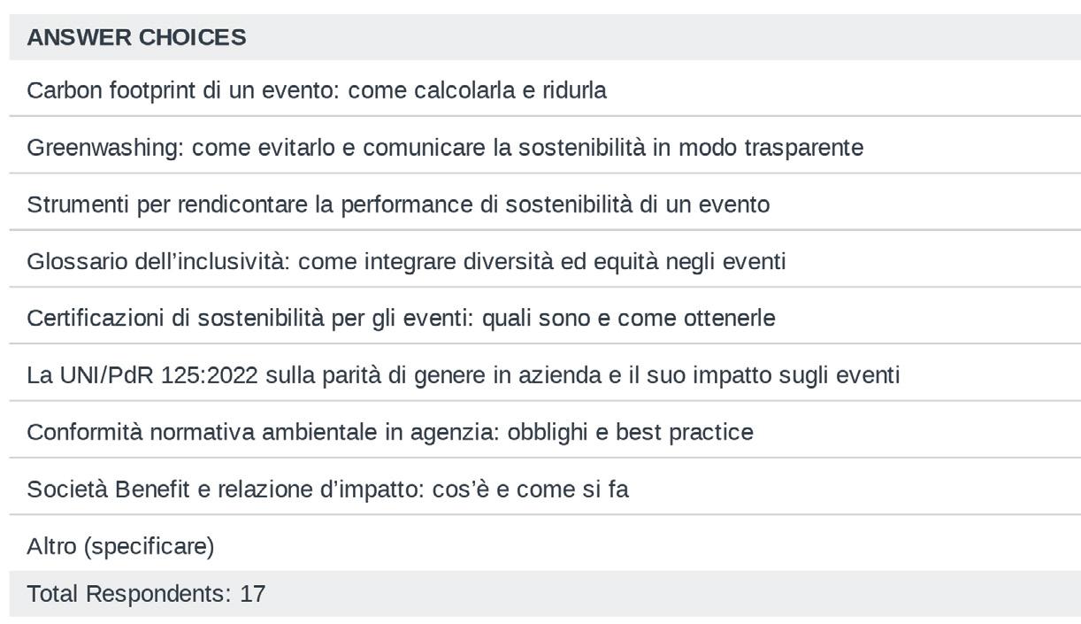 Nel 2025 vorremmo proseguire l’approfondimento sul tema sostenibilità all’interno delle iniziative del Club degli eventi. Quali tra i seguenti aspetti possono interessare te e la tua struttura?