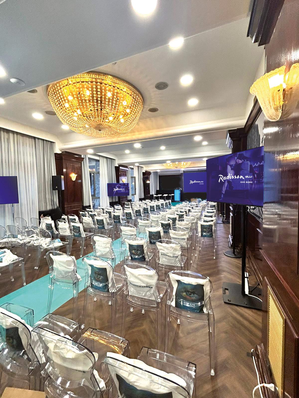 Amplificazione: • Microfoni: • Traduzione simultanea: • Cabina regia: • Podio/Stage: • Linea Wi-Fi: •