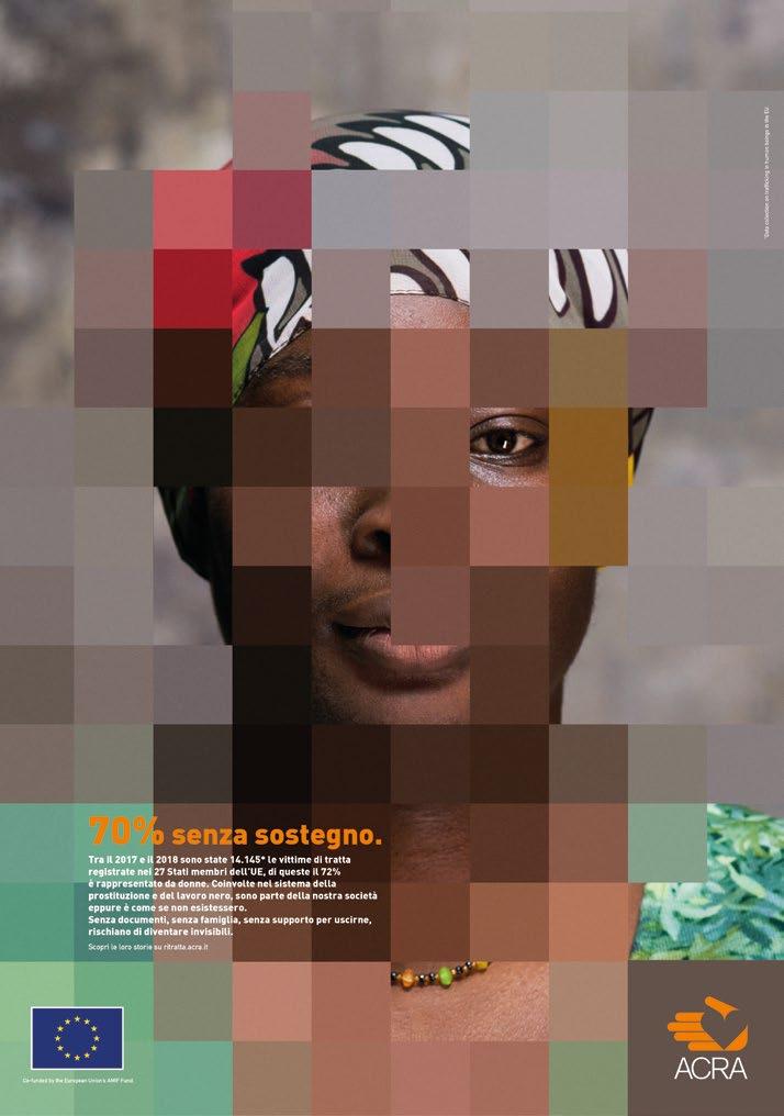 (Guerrera) La campagna ‘RiTratta’ è nata dalla necessità di raccontare una piaga globale spesso ignorata: la tratta delle donne Per sensibilizzare le persone si è scelto di utilizzare i ritratti delle vittime, lasciando dunque parlare i volti per comunicare la drammaticità di una storia vera. Ma comunichiamo un racconto interrotto perché quegli stessi visi sono stati pixelati e le loro identità cancellate, così come avviene per le vittime del traffico degli esseri umani: nel trattamento è stato portato via il 70% dell’immagine, ovvero la stessa percentuale delle donne vittime di tratta registrate nei 27 Stati membri dell’UE. SlaveBox invece parla dei viaggi della tratta, tre percorsi fatti di abusi e violenza. La sfida
