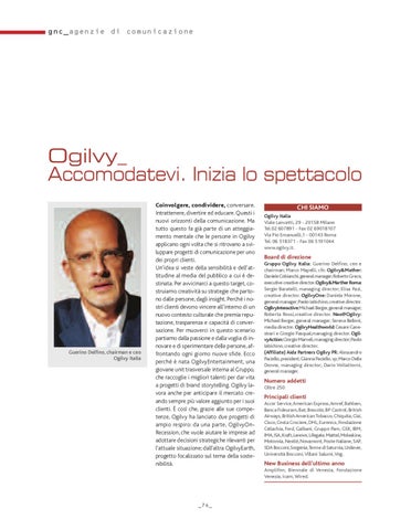 Board di direzione Gruppo Ogilvy Italia: Guerino Delfino, ceo e chairman; Marco Mapelli, cfo. Ogilvy&Mather: Daniele Cobianchi,general manager;Roberto Greco, executive creative director.Ogilvy&Marther Roma: Sergio Baratelli, managing director; Elisa Pazi, creative director. OgilvyOne: Daniela Morone, general manager;Paolo Iabichino,creative director. OgilvyInteractive:Michael Berger,general manager; Roberta Rossi,creative director. Neo@Ogilvy: Michael Berger, general manager; Serena Belloni, media director. OgilvyHealthworld:Cesare Canestrari e Giorgio Pasqual,managing director. OgilvyAction:Giorgio Mameli,managing director;Paolo Iabichino, creative director. (Affiliate) Aida Partners Ogilvy PR: Alessandro Paciello,president;Gianna Paciello,vp;Marco Delle Donne, managing director; Dario Voltattorni, general manager.