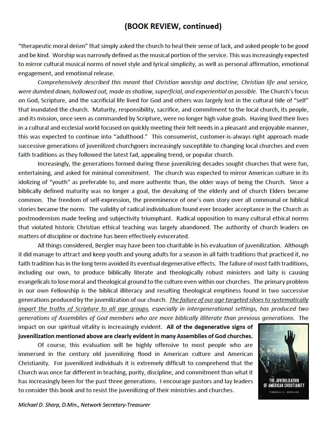 Thomas E. Bergler is a Professor of Ministry and Missions at Huntington University, Huntington, Indiana. There he has taught on youth ministry for many years, having previously served in various capacities of youth ministry. Berger has also served as Senior Associate Editor for the Journal of Youth Ministry. This book is the fruit of many years of education and ministry focused on the subject at hand. Juvenilization is a significant examination and evaluation of perhaps the most influential trend in American culture and the American church during the past one hundred years. That trend is a pervasive move away from a historic valuing of maturity and adulthood toward a devaluation of that and an accompanying elevation of youth culture. This cultural and ecclesial movement is now over ninety years old and has radically changed the values, priorities, and practices of most aspects of American culture and the American church. For decades this juvenilizing trend appeared to bear fruit quantitatively. But, the seemingly healthy growth trends harbored sickness within. The outward appearance of success belied the inward reality of weakness. This reality began to be revealed in the 1960’s and 1970’s, first in the mainline denominations and today in the most conservative evangelical groups.