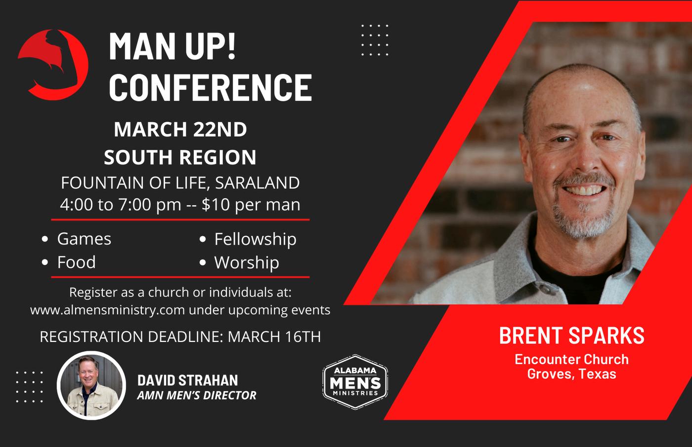Man Up Conference - South Region, March 22nd, Fountain of Life, Saraland 4-7 pm. The cost is $10 per man. Join us for a time of food, games, worship and fellowship with guest speaker Brent Sparks, Lead Pastor of Encounter Church, Grove, TX.