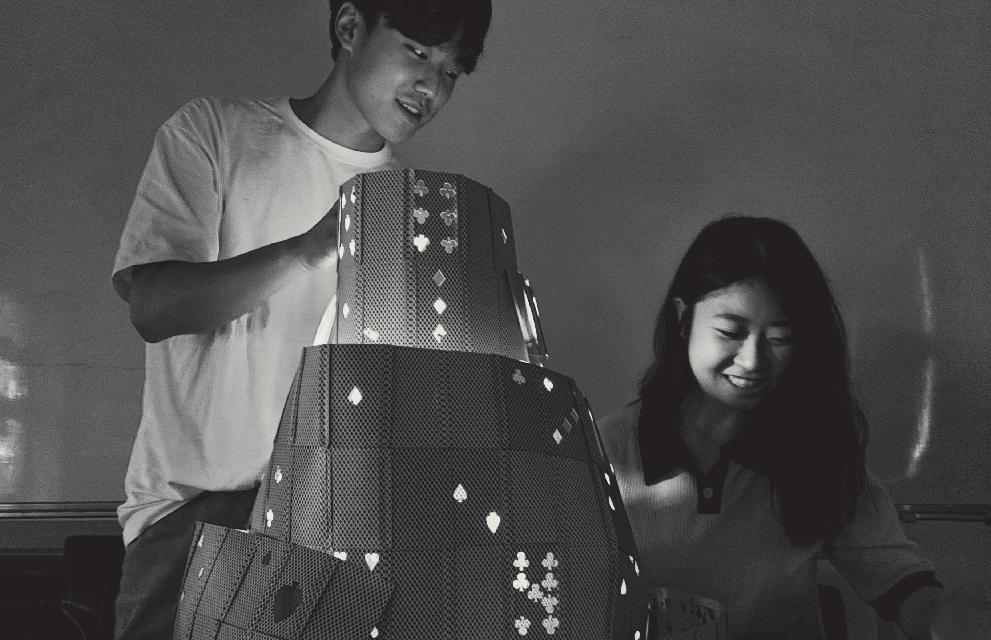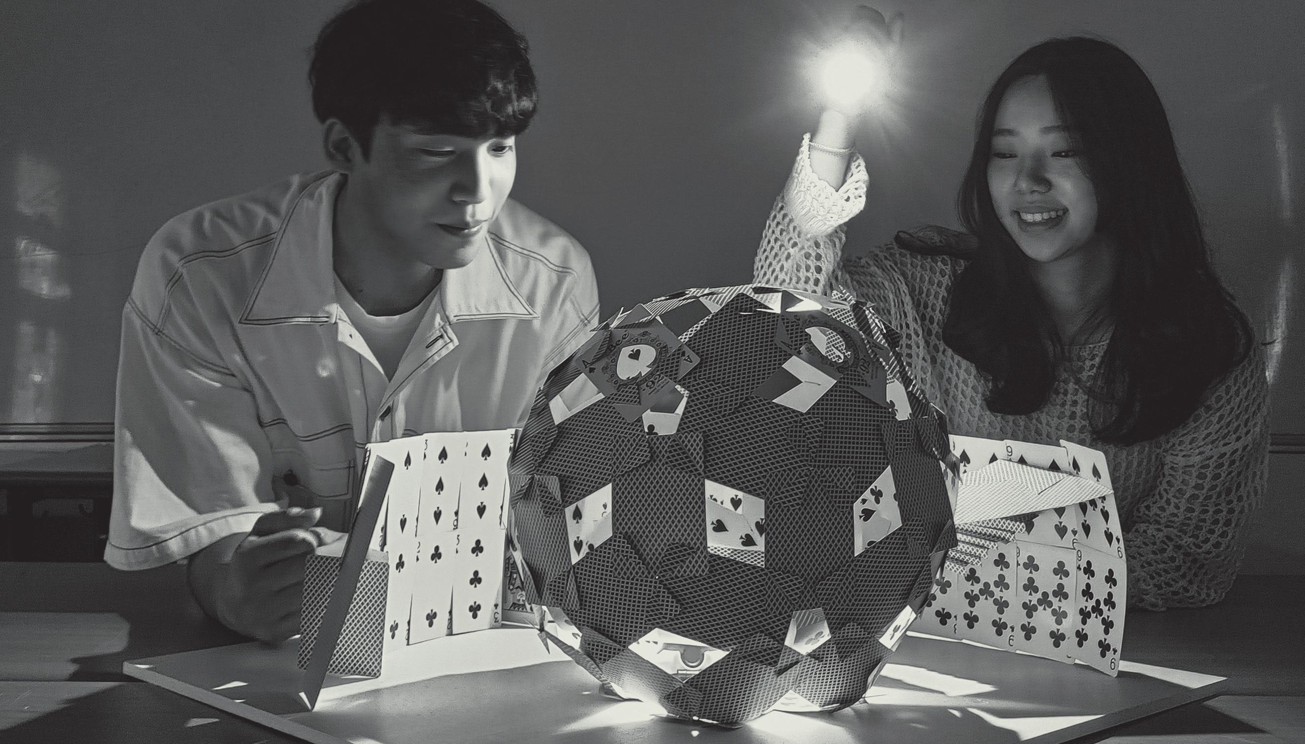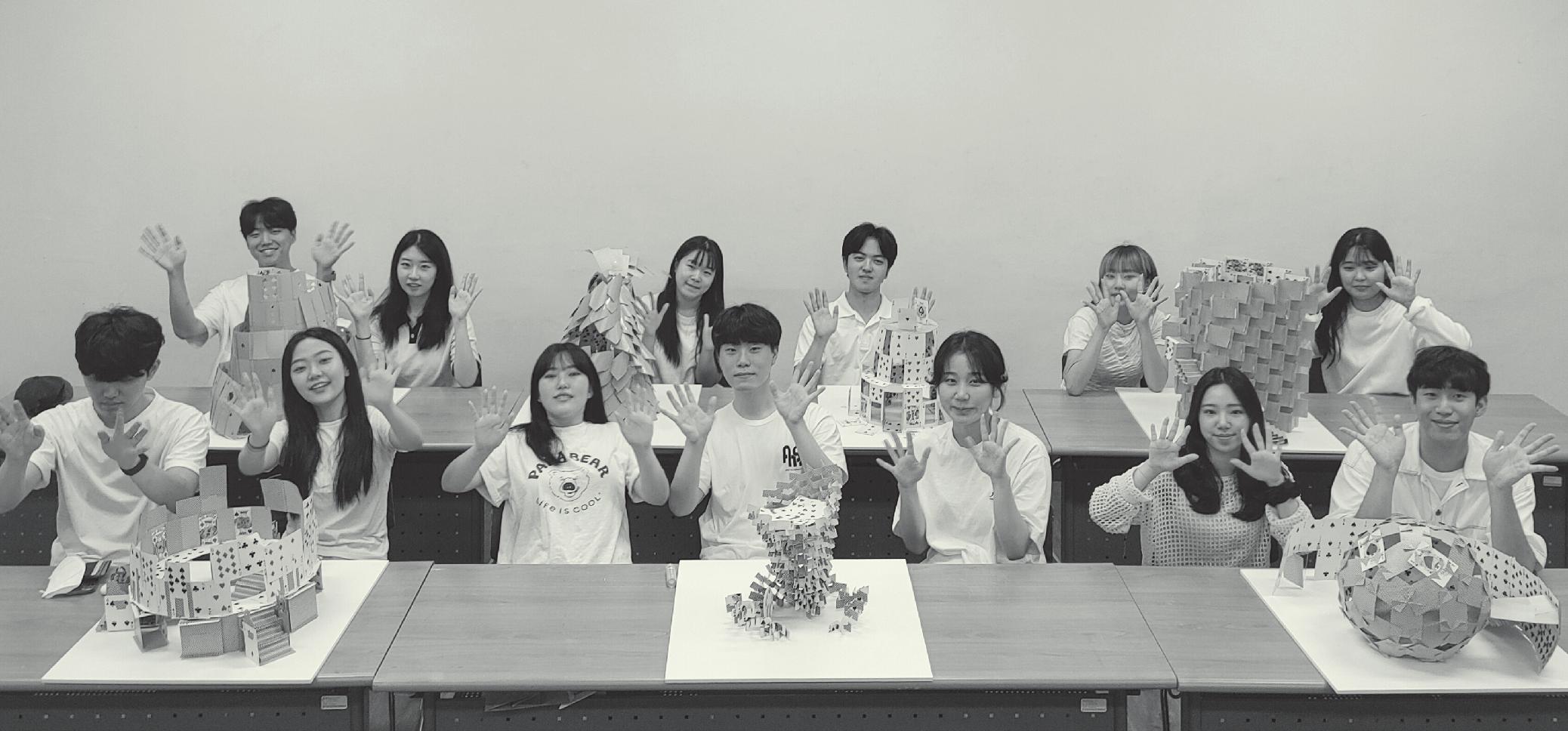 The course required seven teams of 2-3 students to continuously create original works, revealing the students’ unique individuality. The first project involved a simple personal work, where students looked deeply into themselves and expressed their inner selves by creating a mask. The next main project was for the students to create a light tower. This was no easy task the students had to create an original spatial structure that communicates and interacts with its surroundings. The students had to balance elements such as light, space, structure, storytelling, and materials with the five senses and human emotions. The students created their light towers using playing cards and supplemented the towers with video presentations explaining their concepts.