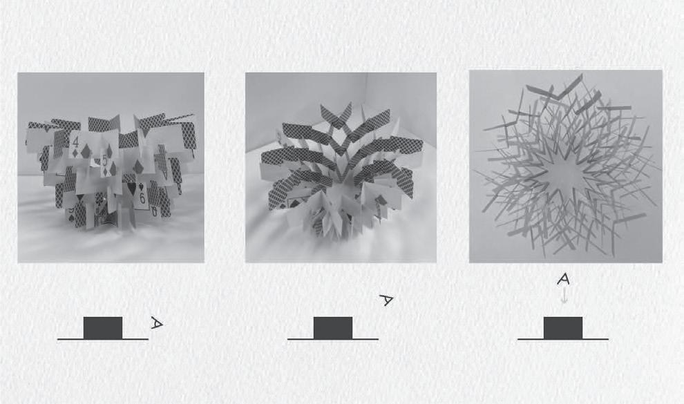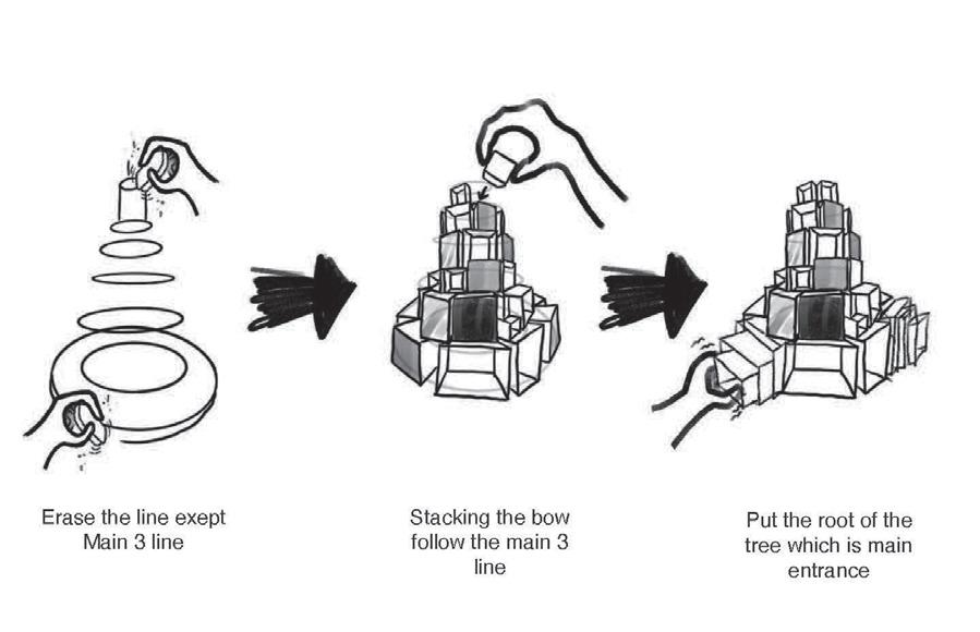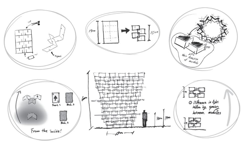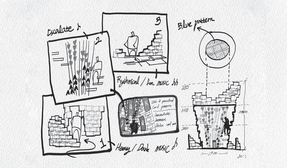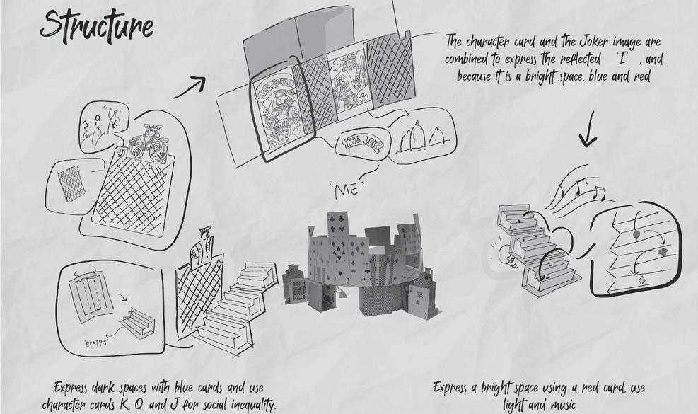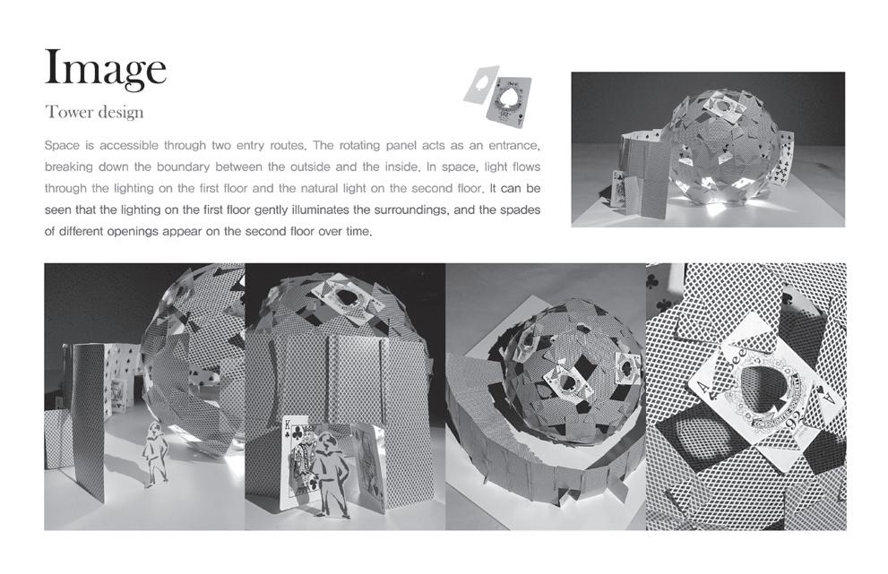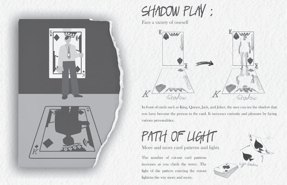 from the spade, which is negative, to the heart, which is positive. Moreover, the number of patterns gradually decreases, and white margins increase in an attempt to ease the user’s emotions in the mind. The structure surrounding the tower guarantees their private space. We created different shadows coming out from the inside of the tower to induce the user’s curiosity.