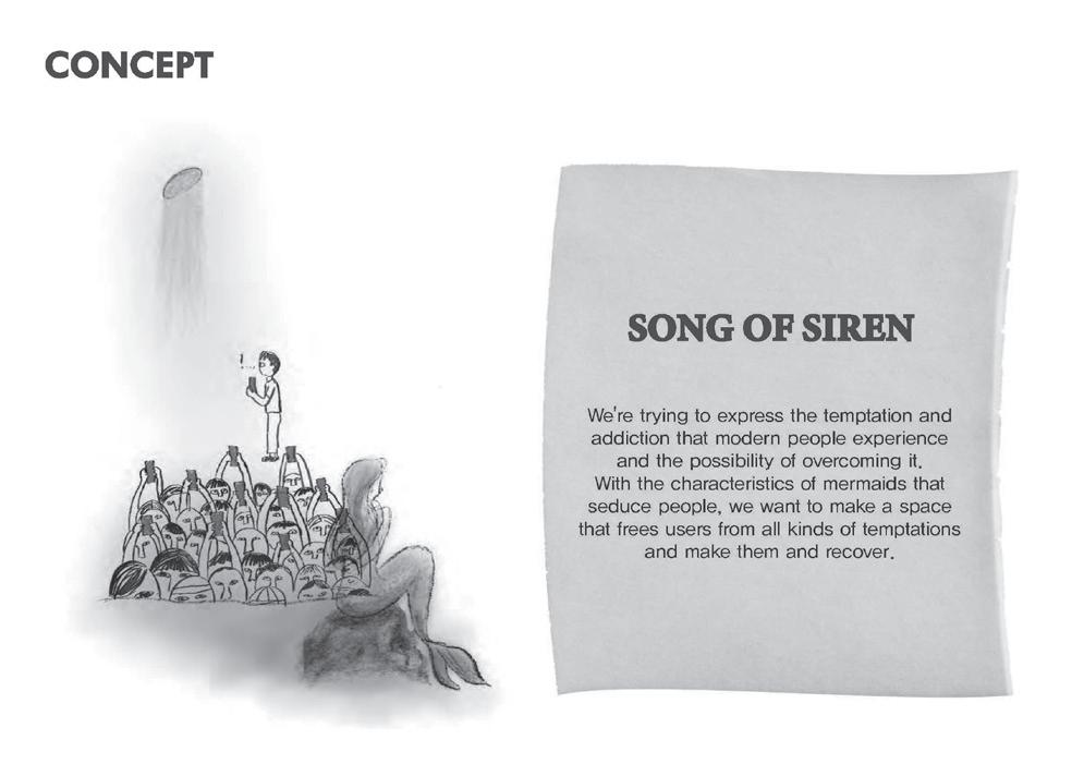 Our concept is a song of a siren. The main goal of our project was to enhance the user’s realization of surrounding temptations and possible ways to overcome them. The tower's form is inspired by the mermaids and it is 17 m high and 7 m wide.