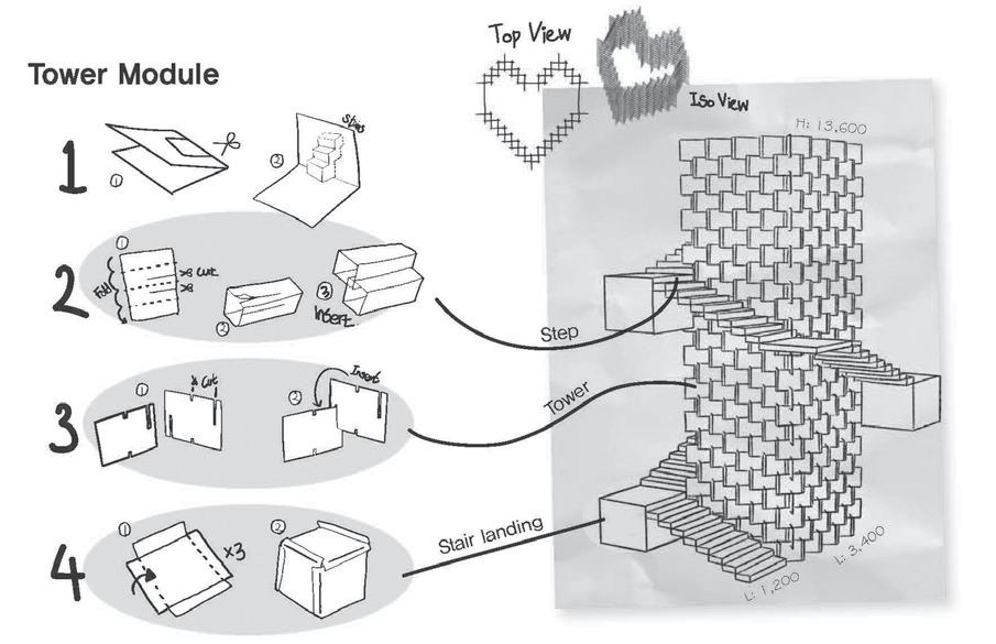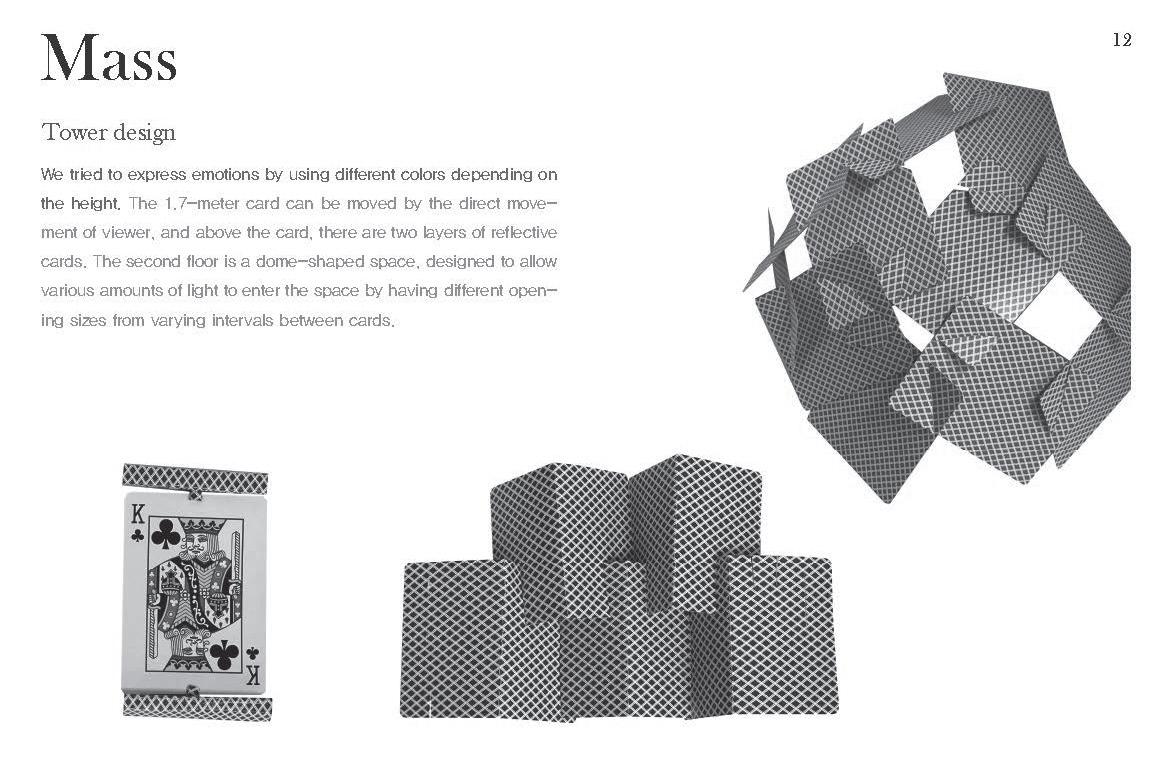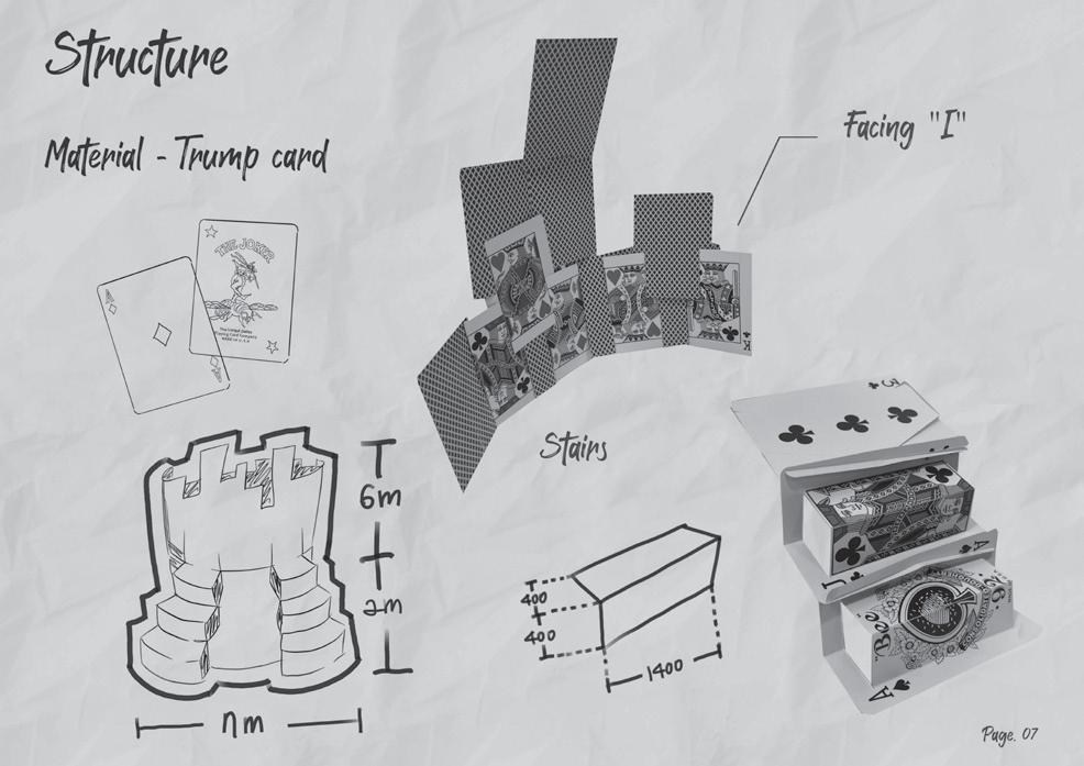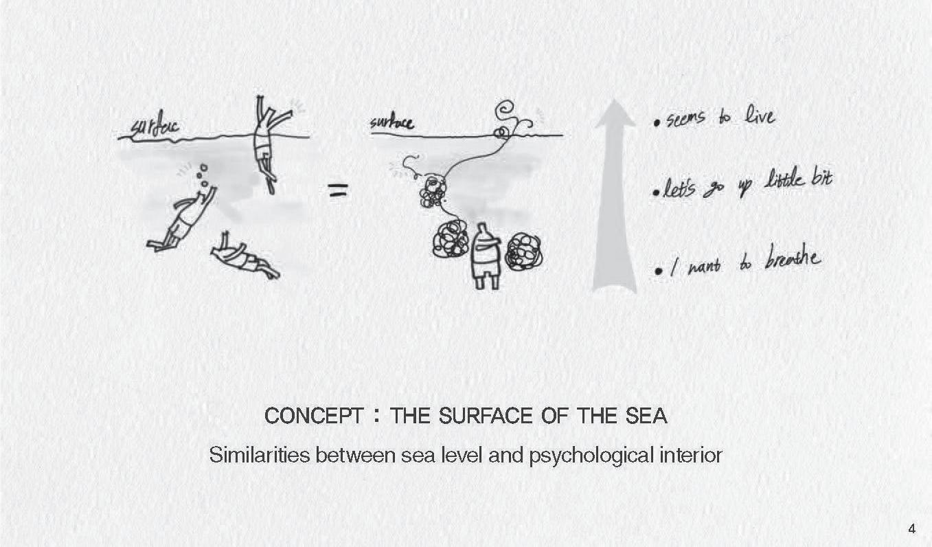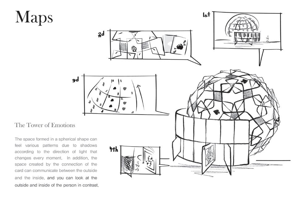 Our concept is based on the surface of the sea. Particularly, we focused on the transcendence of emotions and repetitive behavior that occurs on the surface. This was based on the keywords "imply emotions," "deliver emotions," and "let go of emotions." Thereafter, we determined the general actions and linked them to the card. The main features of the card were continuity, pattern, and color. Each pattern had its own meaning. In this context, we used the spades to express negative feelings and the heart to express positivity while both sides of the card were differentially used to effectively elicit the user's emotions and actions in the space. This illustrates the overall structure and size of the tower and the meaning of its components. Inspired by the repeated wave action, we placed pieces of the card in four equal parts continuously and piled them up in the shape of a tower. The pattern of appearance gradually changes