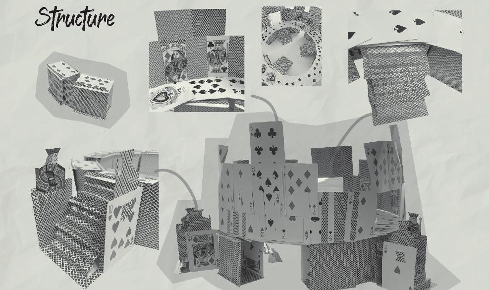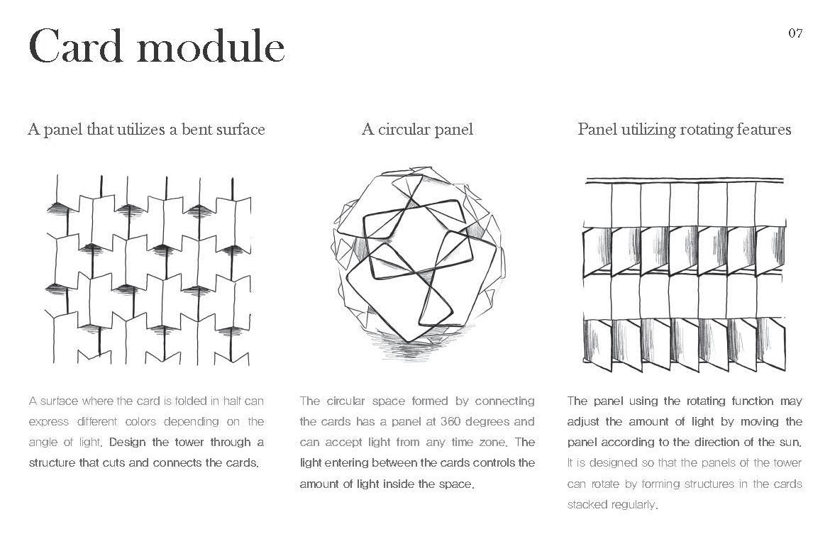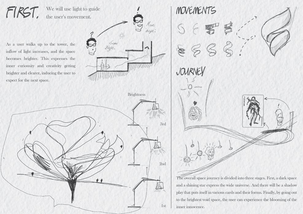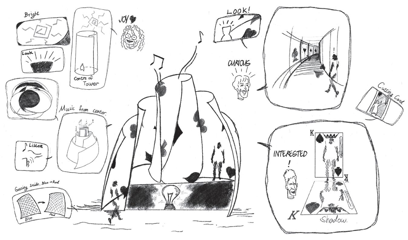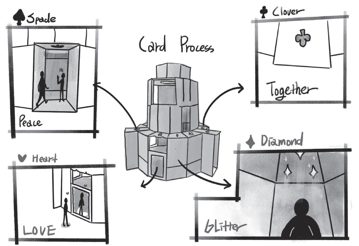the tower and the possible interactions that can be experienced by the users. For example, users can travel through space and play various shadow games. Furthermore, they can experience their inner innocence while listening to music that feels brighter and with enhanced sound. The drawing map above expresses the interaction and behavior of the tower and the user and the figure below describes the card structure. The following is a picture of the model that was created. The picture illustrates the overall structure and interaction that occurs internally.