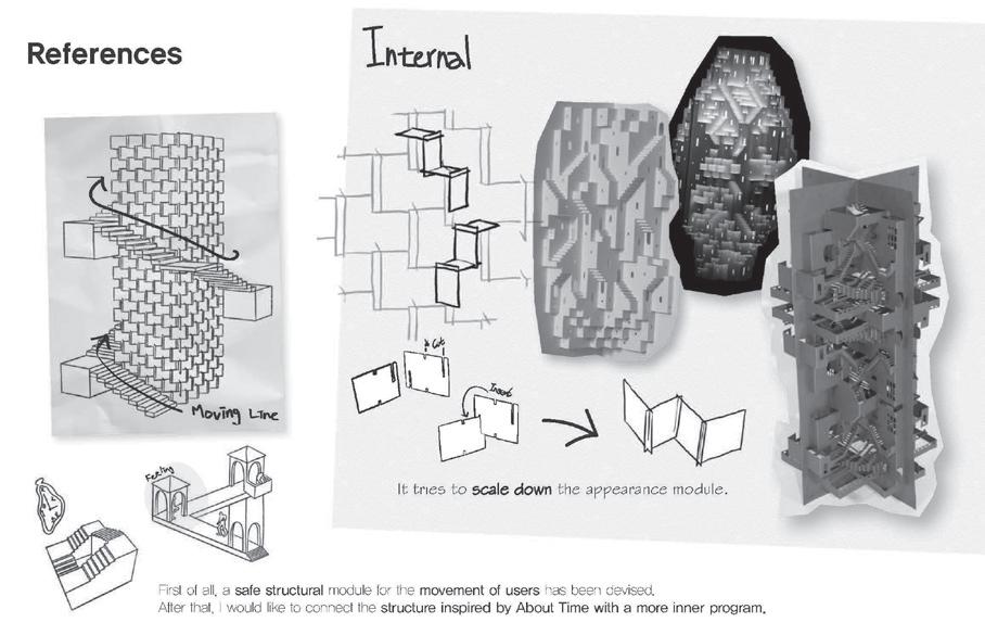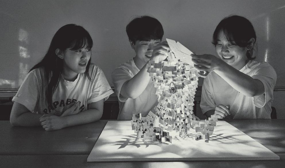 ability to learn about various approaches and expressions of design. Second, we made a structure representing a card in the light tower project. The process of analyzing society’s context and expressing the tower using chameleons was the most memorable. Particularly, using the various characteristics of the chameleon as a communication element and applying this to the meaning of the tower was significant because the tower comprised the meaning of the building, as opposed to the design. Interestingly, forming a tower of communication would connect it to the surrounding area and it could serve as a landmark. Our team's shape took the form of a sphere. Therefore, it was very interesting for us to think about the arrangement and organization associated with using this card and enhance the purpose of the design so that it does not just merely look cool. Furthermore, it was quite impressive to observe the progress through the feedback from Professor Ico Migliore and it was a great opportunity to experience various perspectives, ideas, and problemsolving processes from the context of the teams involved in this project. This workshop provided us with a fresh and fun experience, particularly because we could engage in