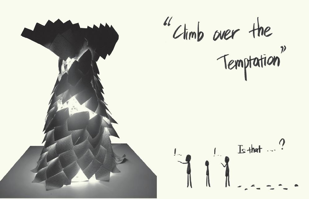 We bent the cards to form scales and provided different meanings based on their color. The lower part is full of colors and signifies temptation. The more distance the user creates between the colors, the more the wall colors change. Similarly, we expect the users to move away from temptations.