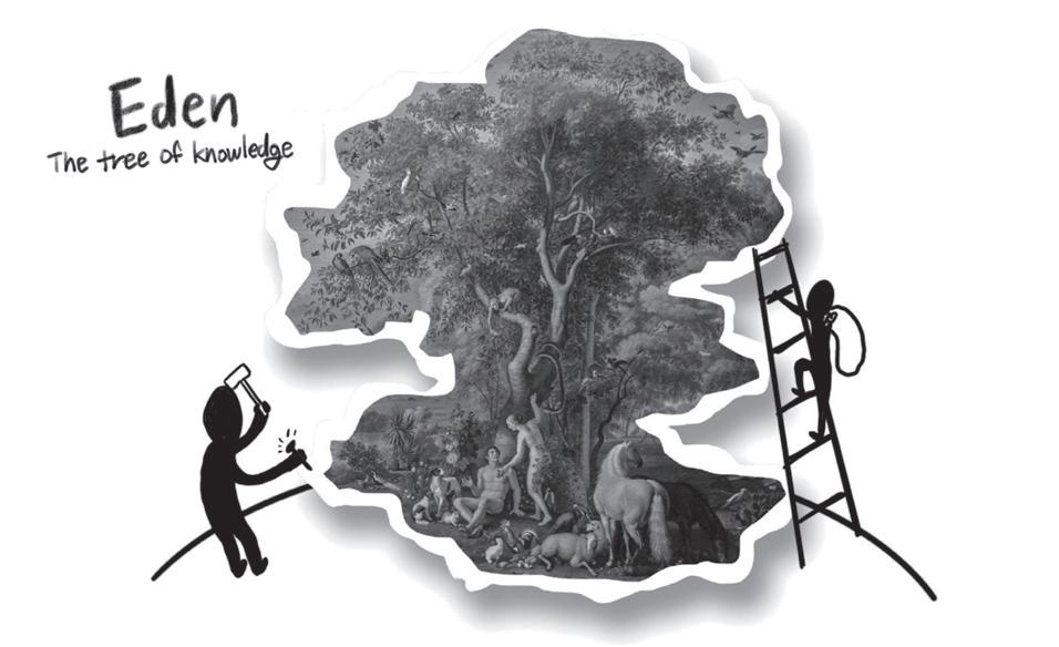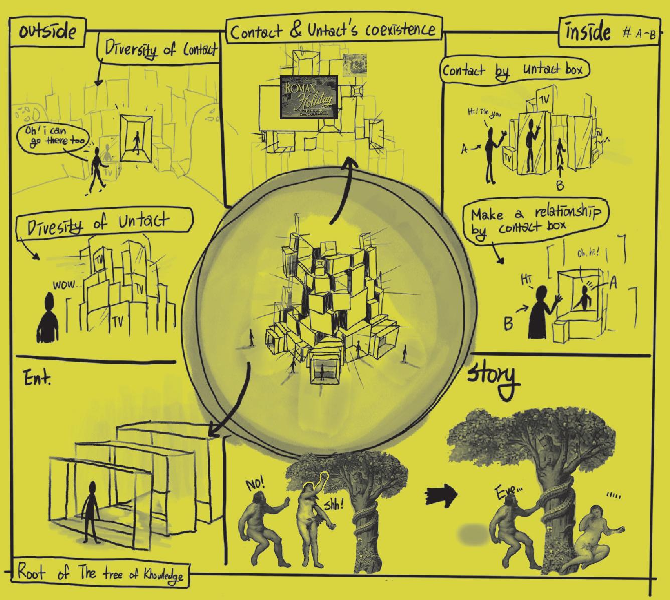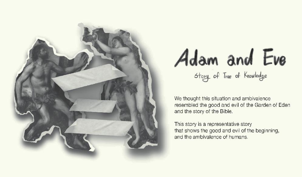 the Garden of Eden as it is the place of the good and evil created in the beginning. While creating these good and evil trees, we considered Namjoon Baek's "DaDaiksun," which represents communication.