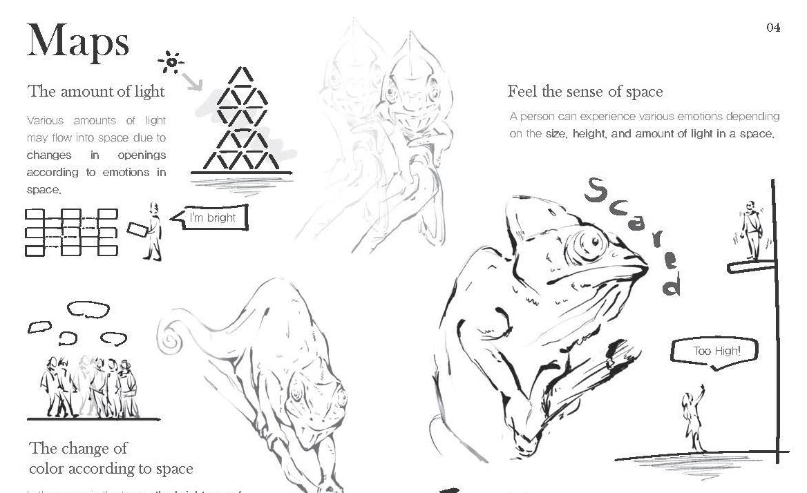 Using the light in the tower, visitors can express and confirm their feelings in various ways. The characteristics of the chameleon can change several times in space by utilizing the element of light. Depending on the purpose of the space, you can also express your emotions by adjusting the degree of light. Chameleons’ eyes can rotate 360 degrees and look around. Communication is based on looking into the other person's eyes while speaking. First, we designed the tower using the eyes. The tower design changes from blue to red cards to express the
