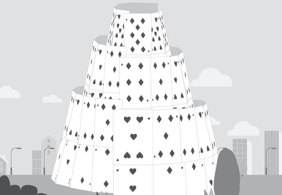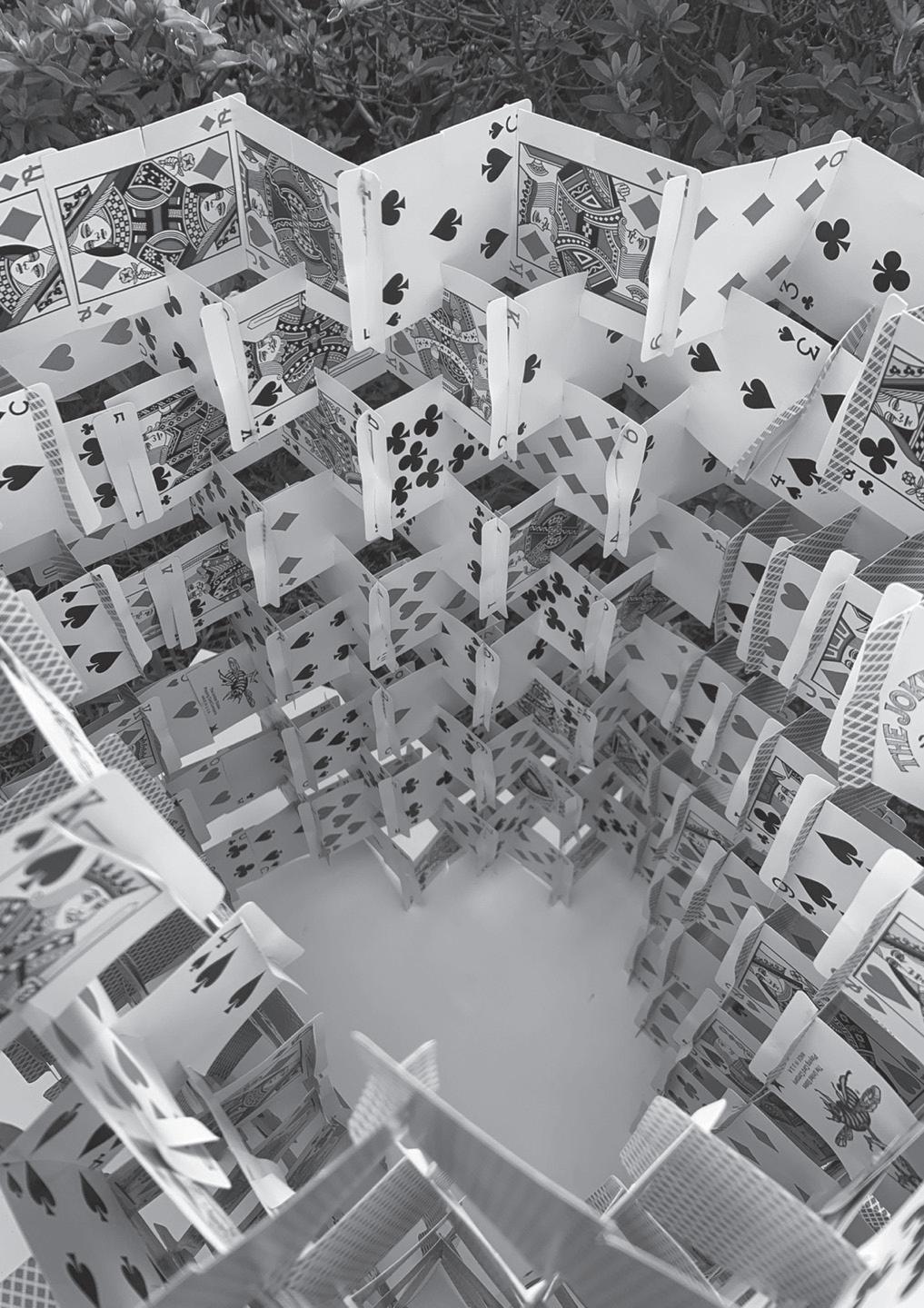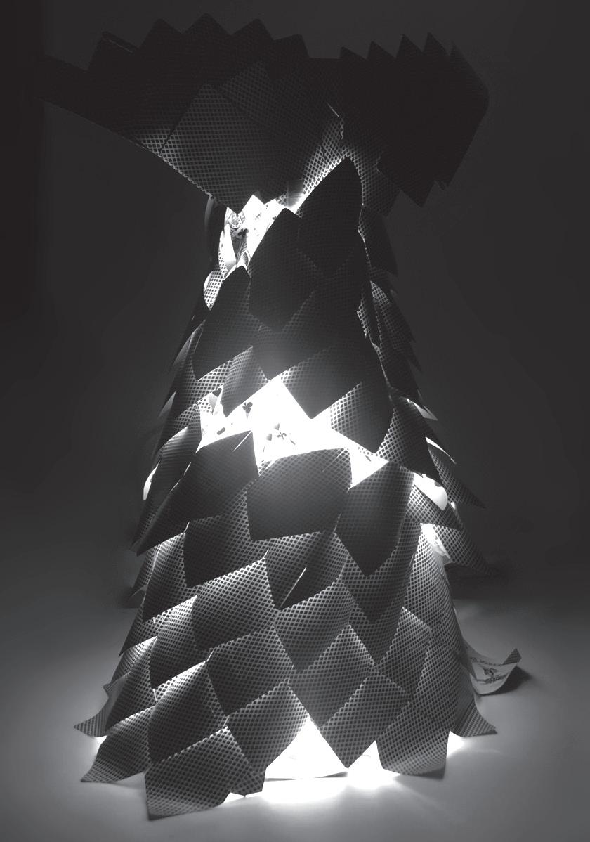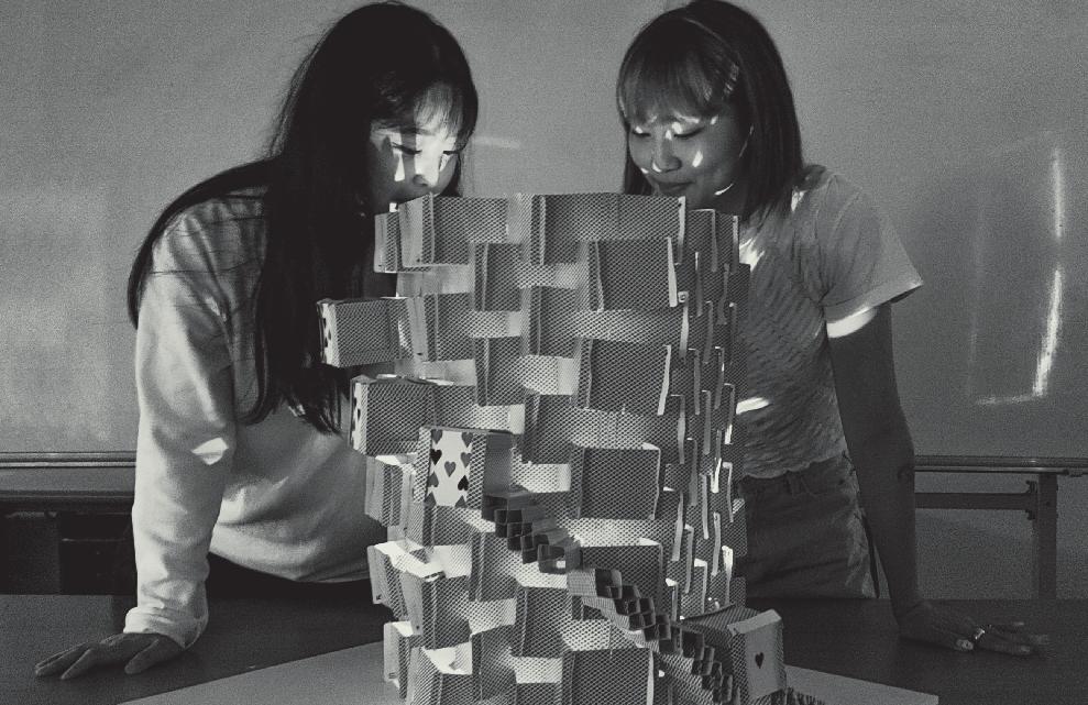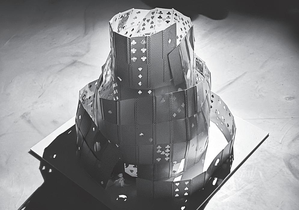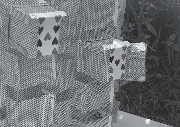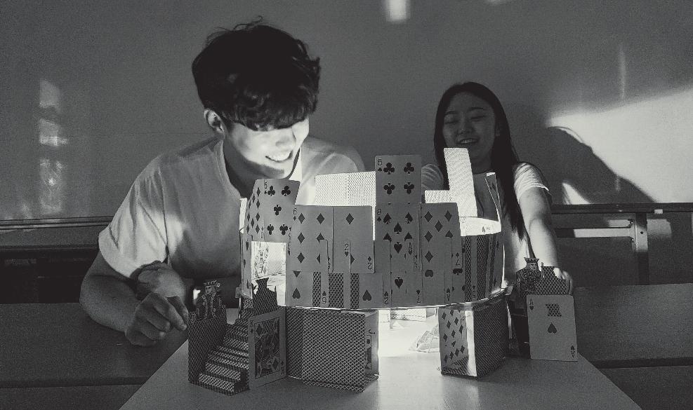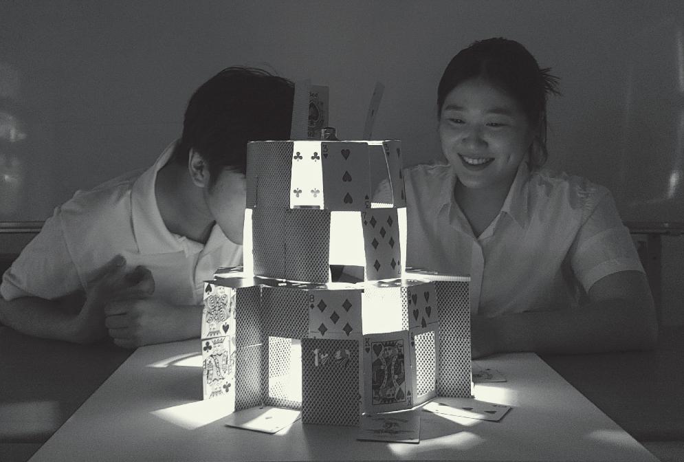 This is our tower. Since there was a part where the shape curves, it was not easy to form. Furthermore, the direction and density of cards made it difficult to create a glow on top.