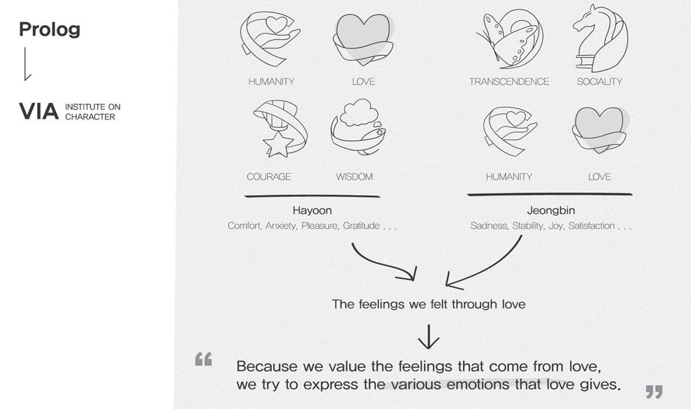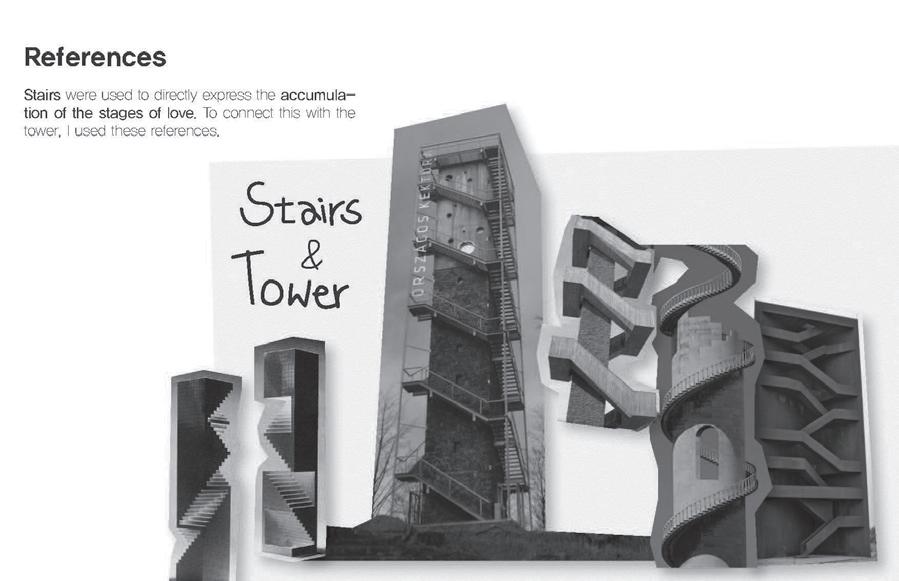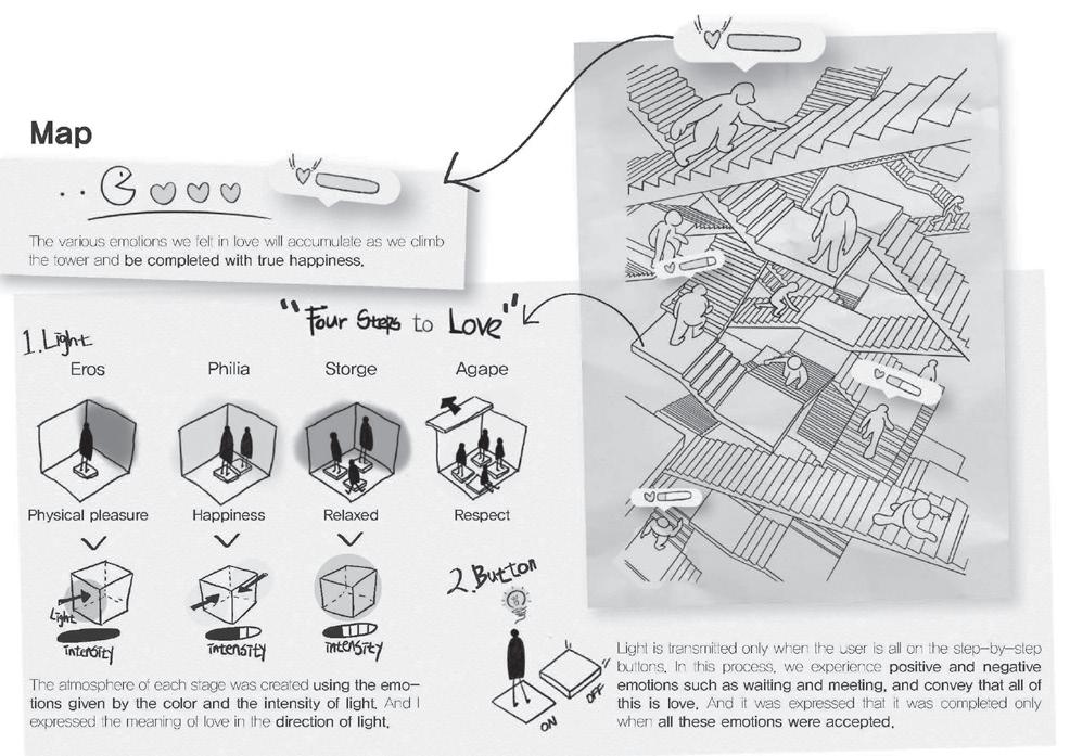 We first expressed our love step by step using the heartshaped towers and stairs intuitively. Furthermore, the lightbox and graffiti on each step encouraged the outside and inside to interact. The internal program consists of experiences of light and fragrance that represent the space of each stage. The user will experience all the positive and negative emotions that are generated by the various relationships that occur in space and learn that all of them are love. This process indicates that "love is complete" only when you accept all forms, rather than avoiding or obsessing over one emotion.