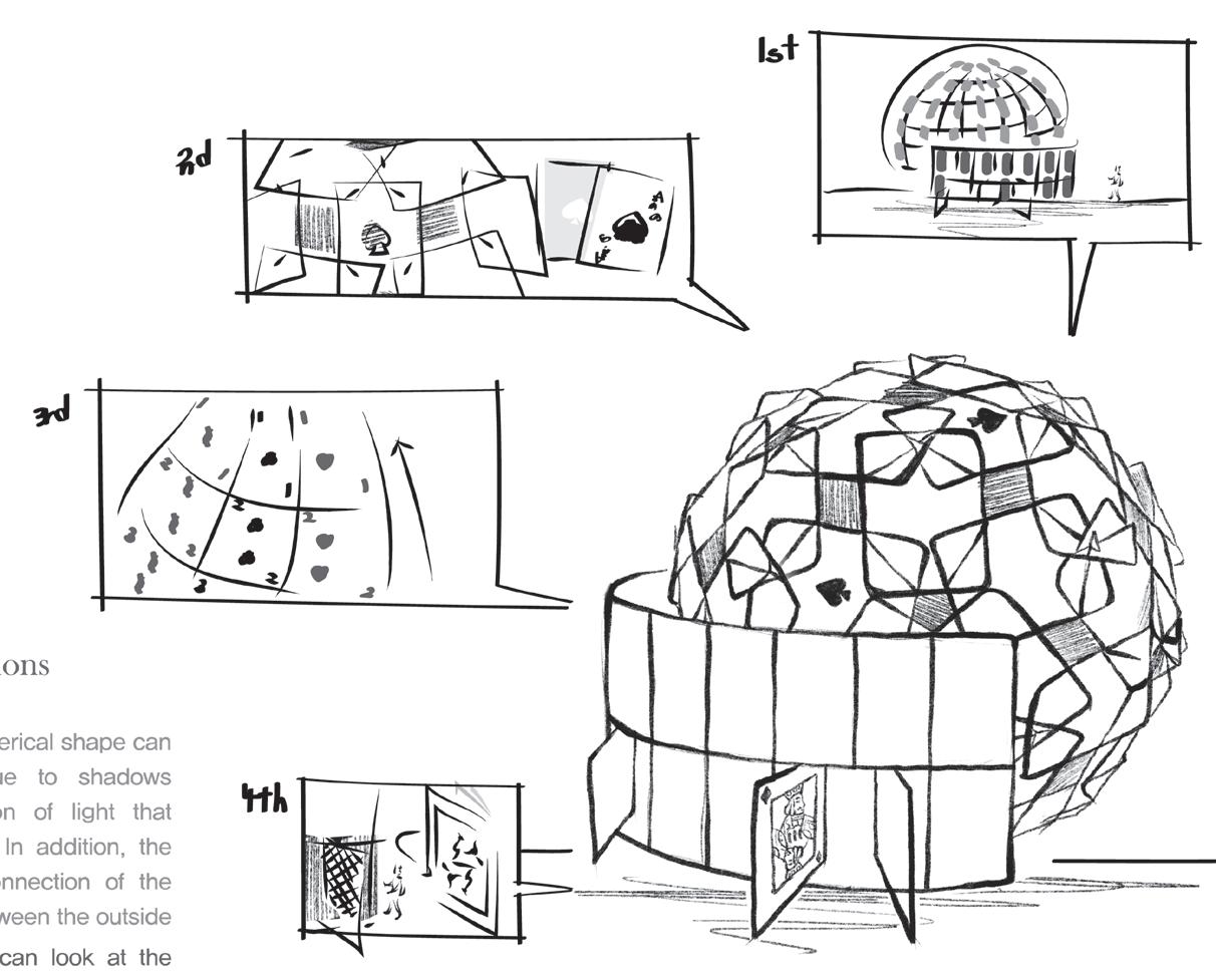 The complex structure has an empty space inside while there is a device in the center that users can directly touch. As users ascend to the top, they observe visual and tactile changes in the surrounding space from spade to hear, K, Q, and J, thus making it easier for them to express their feelings to the pavilion. Moreover, they can relax and enjoy the structure of the final floor with the view of waves.