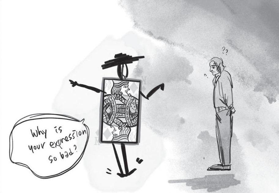 TEAM 7_Videoclubs, hearts, and diamonds represent peace, being together, love, and glitter respectively. The user will feel more confident in themselves by using the glitter of the diamond to establish a relationship with other users by being together through a club, forming a relationship with a heart, and maintaining contact using a spade. This illustrates a copper-based map of these processes. To depict the glitter of the diamond, the diamond pattern was drilled at the top of where the light from the diamond can shine a light on users, boosting their self-confidence. For the club, the reflected user’s figure on J, Q, and K cards is not visible to them despite being visible to another user on the other side. This will prompt a conversation and create a relationship between these two people. For the heart, users can partially face each other and communicate emotionally and clearly in the context of spades.