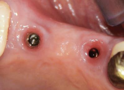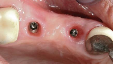 3. La 5 luni după augmentare, s-au inserat implanturile şi s-au conectat cu bonturi multibase pentru fixarea unei restaurări provizorii cu şurub şi încărcare imediată.