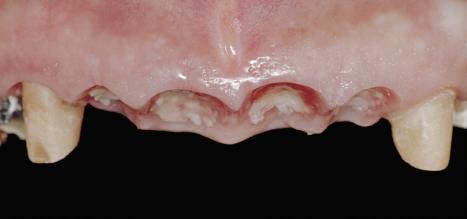 13. Implanturile frontale înainte de îndepărtare. S-a izolat canalul incizal înainte de îndepărtarea implantului, cu scopul de a reconstrui maxilarul anterior.