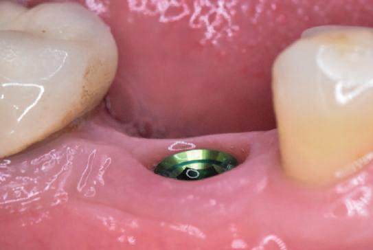TI din poziția dentară 16, apoi trei implanturi de 4,1 x 12 mm au fost plasate în locațiile 17, 16 și 15, și un implant de 3,25 x 13 mm s-a inserat imediat postextracțional corespunzător caninului drept 13, folosind un șablon chirurgical și un cuplu de 35 Ncm. Pe implantul 13 s-a aplicat un șurub de acoperire și au fost plasate bonturi de vindecare pe celelalte trei implanturi.