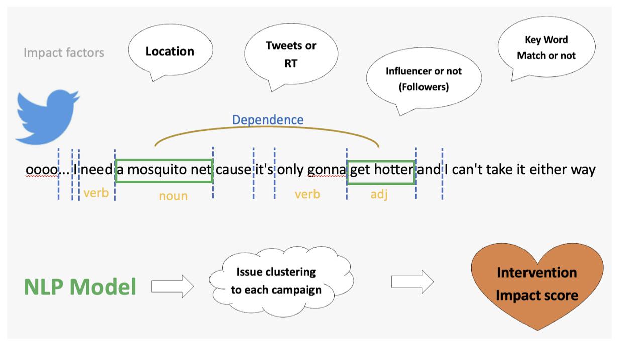 When using the Tweepy API [4] for Twitter, from the posts, we can get location data, the main text message, whether these are tweets or retweets, or whether the tweeting is an influencer or not. With this, we narrowed the range down to Nigeria for the samples, which has high internet and mobile phone penetration rate, and sharing on social media is popular and widely used in English. Then we got rid of stopwords and retweets and used its clean main message as a corpus to train the NLP model. With the iterations of the process above, we built an entity list and corpus. Now when we put the post as input, the language model can process it and gives a result of what entities the post has and what the topic is about. Then the post-processing model to score the relevance between the three topics and the main message of the posts is necessary after this step. It can widely vary, but the basic logic is to set up the standards to
