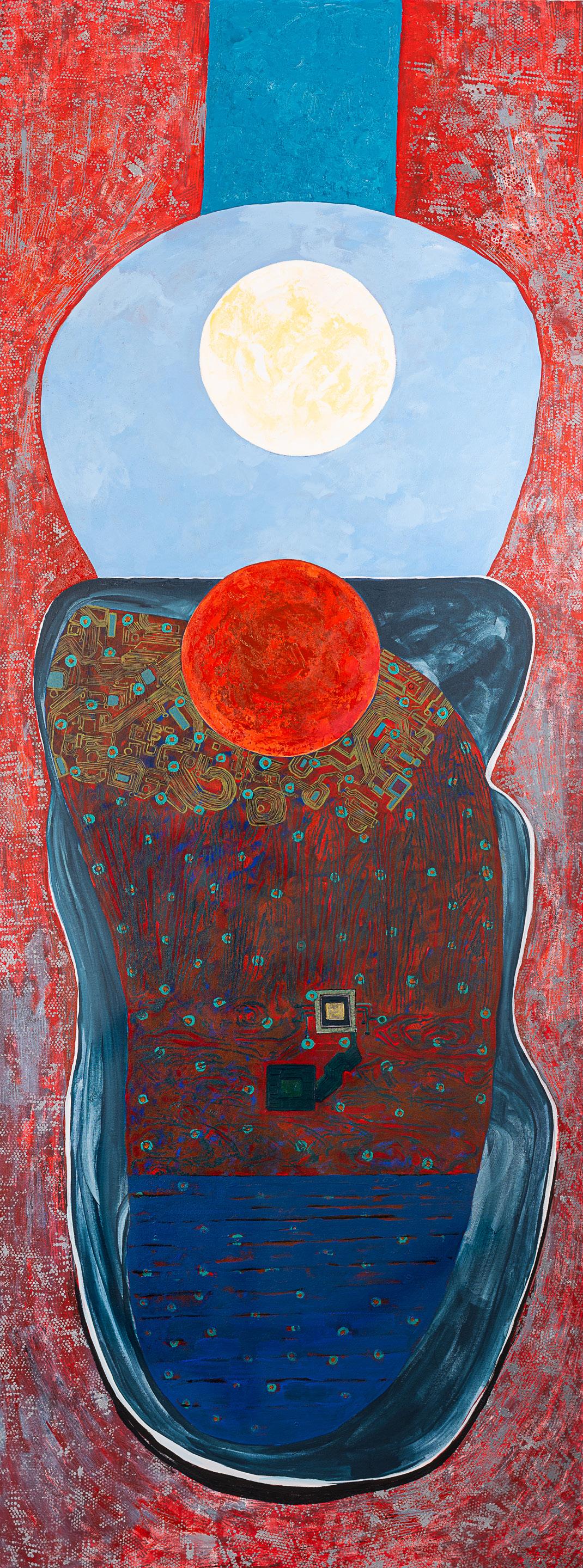 Merikokeb’s immigration to Maryland, USA in 2017 marked a time of sudden and intense change in all aspects of her life, a shift that is nowhere more evident than in her paintings. While Merikokeb’s work has always had a focus on lifeforms and biomorphic imagery, at this point she started to gravitate towards the more vibrant hues that define her latest paintings. New symbols – a circuit board structure, the skeletal remains of fish – began to emerge throughout Merikokeb’s work as she grappled with the implications of a society estranged from nature.