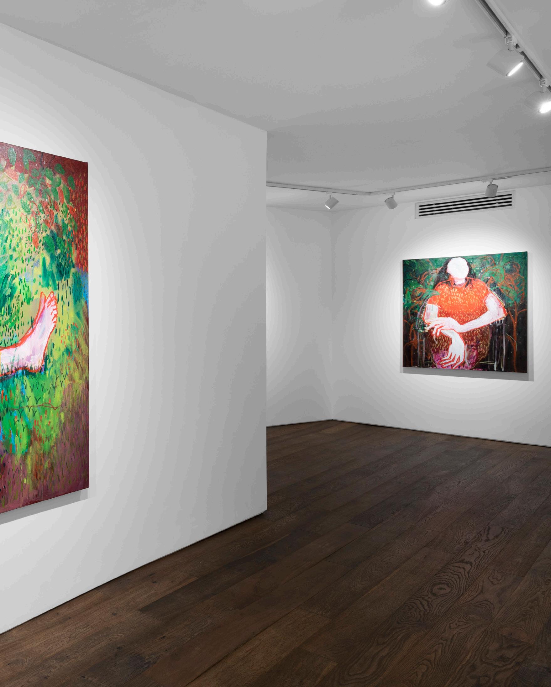Selome crafts rich internal worlds through the colour-laden interior scenes of her canvases, which frequently depict women in states of inner reflection. The gestural, loose quality of her strokes coupled with her sophisticated blending of pastels with vibrant shades of crimson and green creates an atmosphere both quiet and complex. The patterned fabrics incorporated in many of the works are a nod to the traditional Ethiopian textiles which Selome grew up with. At times, the faces of her characters are obscured or cropped, and the viewer is invited instead to focus on the sparse array of objects that decorate the room. A drooping plant, a dozing feline companion, a distant crooked framed portrait – the line between living and non-living objects becomes blurred, and the viewer is encouraged instead to focus on the sheer physicality of being. Much like Giorgio Morandi’s bottles and bowls, the flattened characters and objects born from Selome’s brush seem to hum serenely with the energy of their very existence.