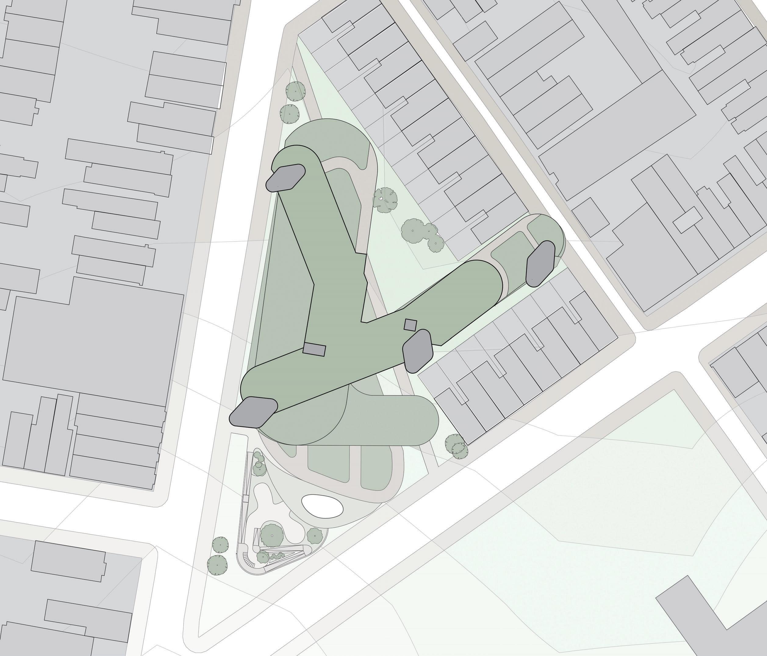 The Ark Apartment are an urban sanctuary, adding large green spaces to Francisville. The Ark Apartments are located across from the Francisville Park, connecting it to the attatched branch library on the basement and ground floor levels of the apartments. The apartments themselves are suspendded over the site, allowing for greater amounts of space for community members to gather, as well as to provide a quieter park space than the one across the street. The apartment twists above in order to capture light and views for the residents. Multiple roof gardens sit on top of the building, providing residents with better views and more private access to green space. The library sits underneath, providing a community focused base for the entire structure and site.