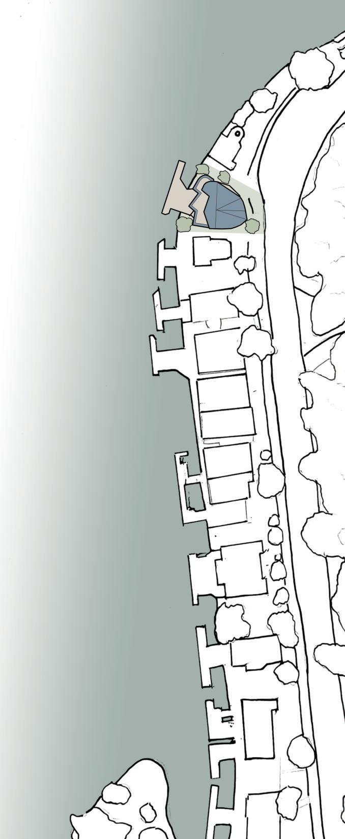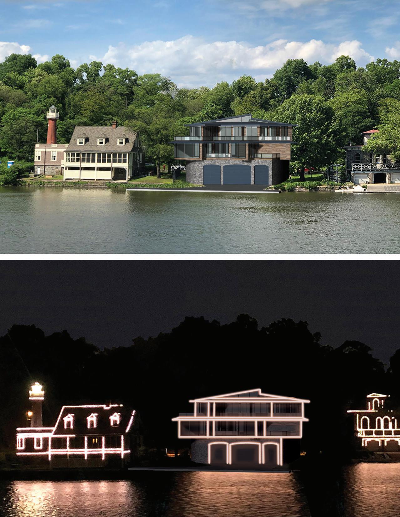 The PCR Boathouse was designed for Philadelphia City Rowing, a community rowing team. The boathouse places a focus on light and the lifting of space. Due to the boatstorage being more private, the base has the least amount of windows and heaviest material. This also serves to ground the building and to make the upper floors seem lighter and more airy in comparison. Large deck spaces wrap around the building with operable floor to ceiling windows that help to connect the building to the river. The shape of the building with the curves and triangular windows was born out a desire to capture views of Waterworks, Center City, and the Schuykill River. The curved shape responds to the fluid nature of the river as well as a juxtaposition between it and the rest of Boathouse Row.