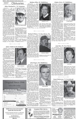 John Rogers, 86, Middlebury JAMES ANDERSON on Friday Feb. 3, 2017 at 11 a.m., at the Bridport Congregational Church, with the Rev. Tim Franklin Officiating. Burial will be in the spring in Bridport Central Cemetery. Memorial contributions in lieu of flowers may be made to the Town Line First Response at P.O. Box 82, Bridport, VT 05734. Online condolences at www.sandersonfuneralservice.com.◊