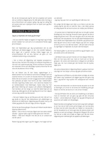 TOPPREP & SVINDEL ”Jag är ju höjdrädd, det hade jag förträngt” – Att vara rädd för höjder är logiskt. En hög höjd i sig är farlig, så den rädslan har varit och är en evolutionär fördel, säger Jens Driessen. Men när höjdrädslan ger dig symaskinsben där du står fastfrusen på klätterväggen är den inte särskilt hjälpsam. Jens säger att vi genom övning måste bygga upp en erfarenhetsbank för att lära hjärnan att göra en mer realistisk bedömning av situationen. – När vi tränar på någonting nytt kopplas synapserna i hjärnan ihop. Det som från början är snårig terräng bildar en mer och mer upptrampad stig. Till slut resulterar tränandet i ett motoriskt minne och tillräckligt mycket erfarenhet för att veta att situationen inte är farlig. För att Robert ska få den bästa vägledningen in i klättervärlden har han klättrat med erfarna kollegor som har coachat honom. En av dem är Claudia Adamo. Hon började klättra för sex år sedan, när den snygga bartendern på stället hon jobbade på bjöd med henne på dejt i klätterhallen. Det blev ingenting mellan dem, men däremot inledde hon en kärleksrelation med klättringen. Sedan dess har hon gått linjen Klättring och topptur på Lofotens folkhögskola. Hon berättar att hon länge var rädd för både höjd och att skada sig, vilket gjorde att det tog lång tid innan hon vågade utmana sig utanför komfortzonen. – Det som hjälpte mig var att fokusera på mitt mål och hur jag skulle ta mig dit. Min klätterlärare på utbildningen sa också att om klättring är någonting jag vill syssla med, ja, då måste jag jobba för det och våga utmana mig själv. Så här lät det första gången Claudia och Robert skulle klättra topprep tillsammans: Robert: – Ska vi inte ta med oss någon som kan säkra också? Claudia: – Jag kan säkra. Jag har både grönt och rött kort. Robert: – Rött kort? Betyder inte det att du är utvisad och inte får säkra?