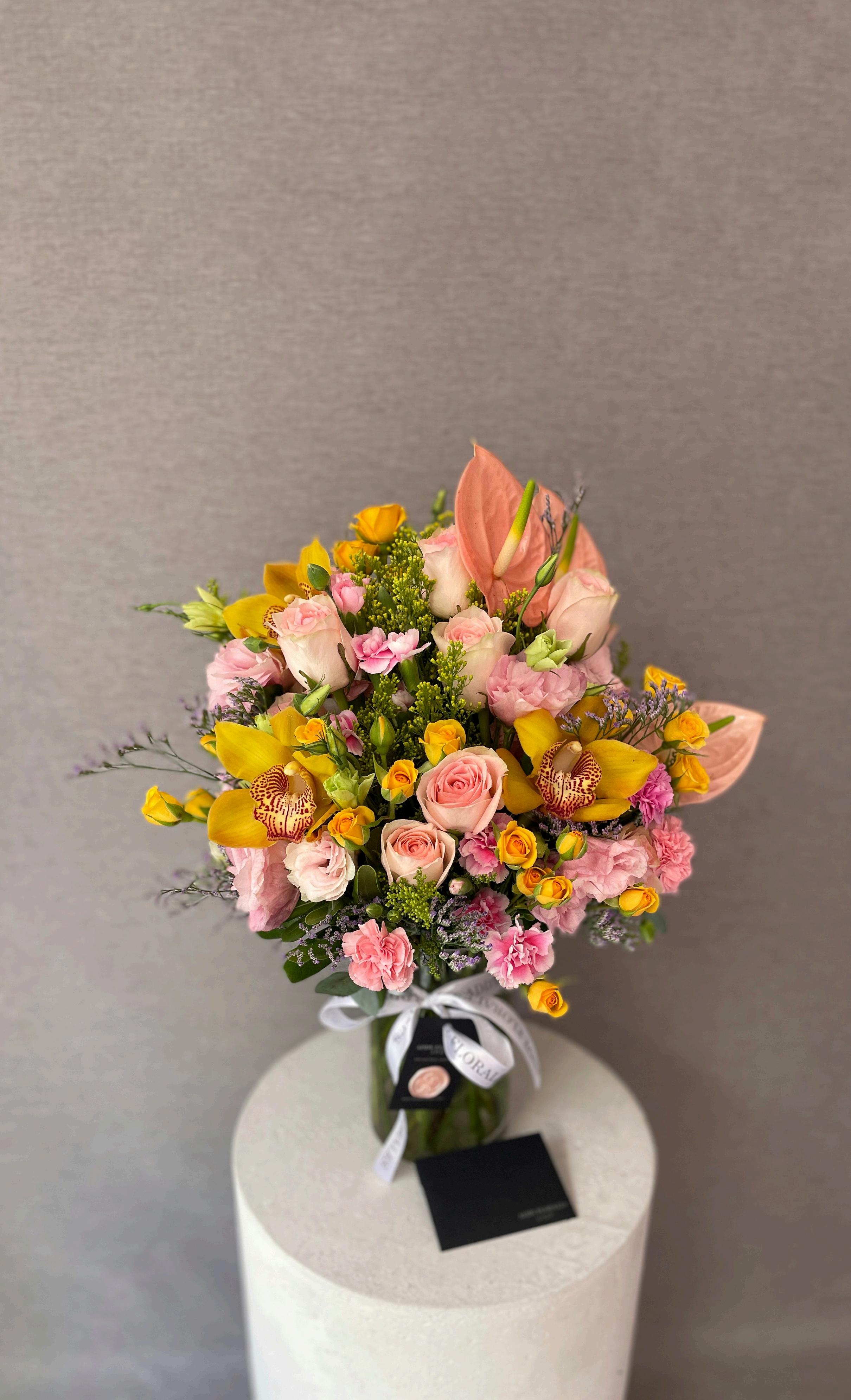Diseño floral con rosas, mini rosas, orquídeas cymbidium y flor de complemento en florero de vidrio.