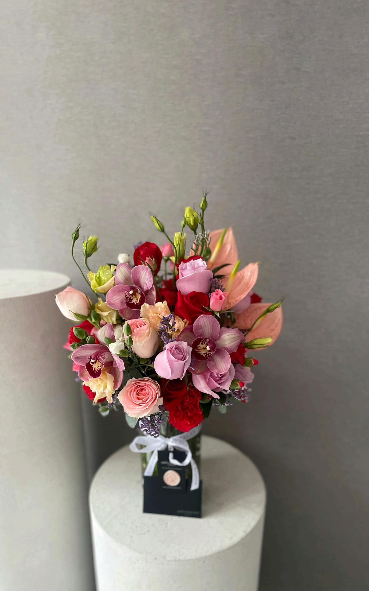 ROJOS ROSADOS Y LILASHermoso diseño floral en caja negra de rosas, mini rosas, orquideas con flor y follajes de complemento.