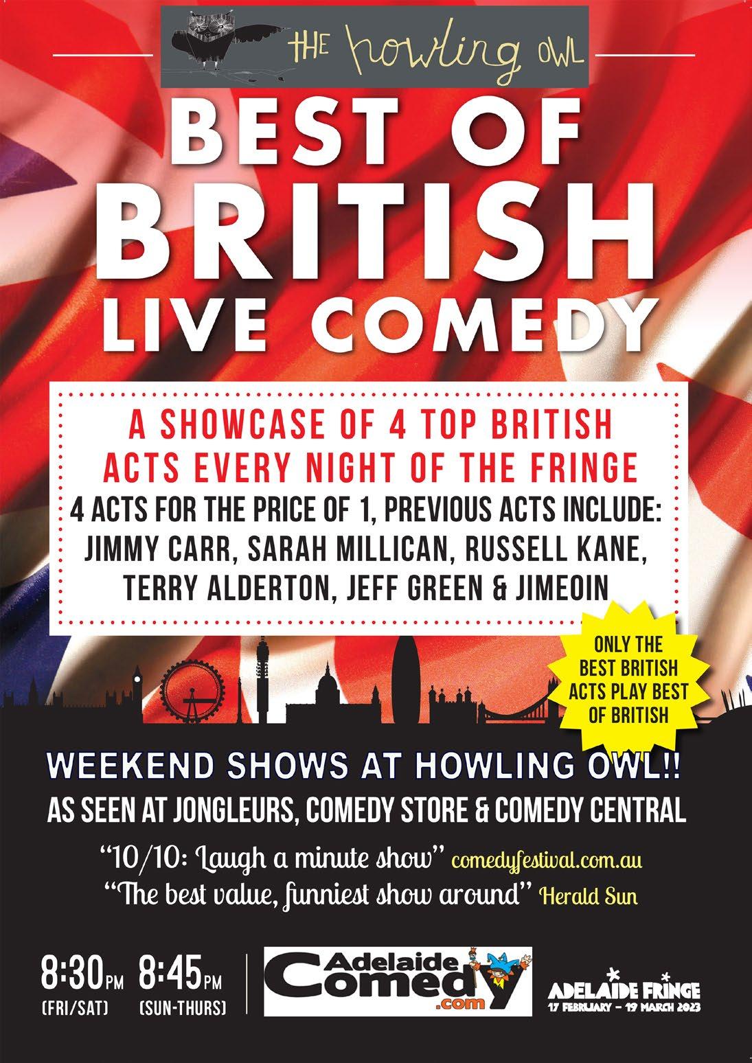 Heath Franklin - Out of Character 66 Innes Lloyd - Journey to the Centre of the Earth 28 Jarred Fell - Fresh 84 Jarryd Goundrey - Good Lord! 51 Jo Ghastly - The Cool Mum 54 John Hastings - Do You Have Any Ointment My John Hastings? 29 John Lynn - Irishman in Oz 65 Jon Brooks - Nobody 38 Jordan Raskopoulos - The Fool 41 Justin Hamilton - Little Victories 33 Kirsty Webeck - A Bit of Fun 63 Lauren Bok - Peak Bok 18 Lauren Thiel - Who Told Dad? 21 Lewis Garnham - Hit a Pigeon With His Bike 14 Lloyd Langford - Current Mood 15 Lost in Translation 76 Luke Heggie - Grot 11 Marion Hotel Sunday Sessions 75 Markus Birdman - The Bearable Heaviness of Nearly Not Being 31 Michael Hing - Long Live The Hing 37 Nath Valvo - Hit Machine 67 Nick Carr - The Invisible Hand 40 Nicolette Minster - Net Worth 55 Nikki Britton & Claire Hooper - Live