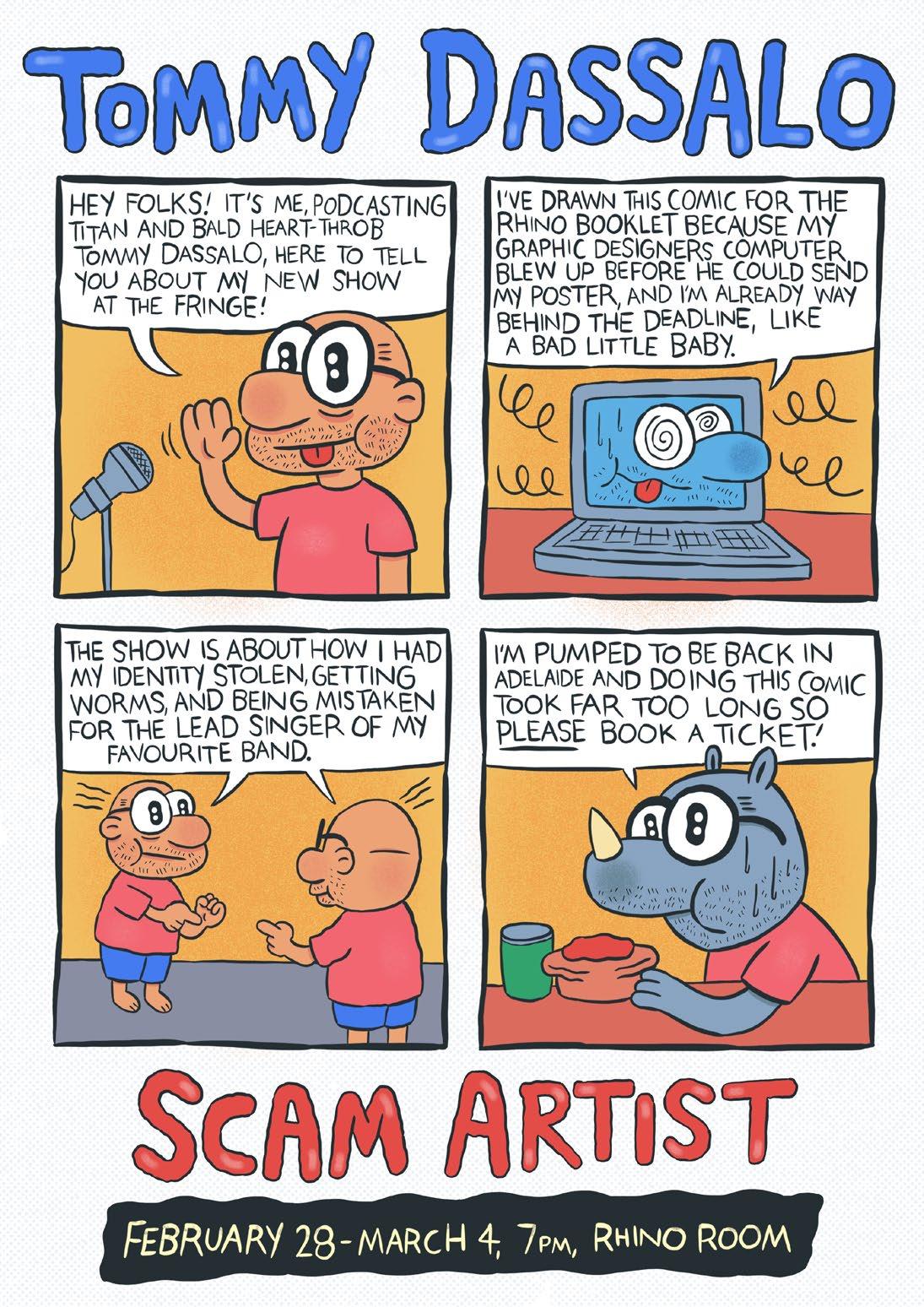 45 Oliver Coleman - Neon 36 Paul McDermott Plus One - Blood Orange 81 Reuben Solo - Palindrome 10 Rhino Room Late Show 34 Rudy-Lee Taurua - “Diverse” 69 Sad and Sexy - Live Podcast 78 Schalk Bezuidenhout - Feeling Good 42 Shad Wicka - How I Almost Killed a Guy 87 Shayne Hunter - True Crime Comedy Walking Tour 82 Sunanda Loves Britney 25 Suraj Kolarkar - Que Suraj Suraj 49 Suren Jayemanne - Crazy Wisdom 43 Takashi Wakasugi - Japanese Worry 61 Tania Lacy - Everything’s Coming Up Roses 27 The Full Irish 72 Thomas Green - End of Daze 50 Ting Lim - Every Ting or No Ting 73 Tom Ballard - It Is I 77 Tom Cashman - Graphs 48 Tommy Dassalo - Scam Artist 70 Vanessa Larry Mitchell - Teardrops on my Dildo 47 Vida Slayman - Comedy of Terrors 68 Women Like Us