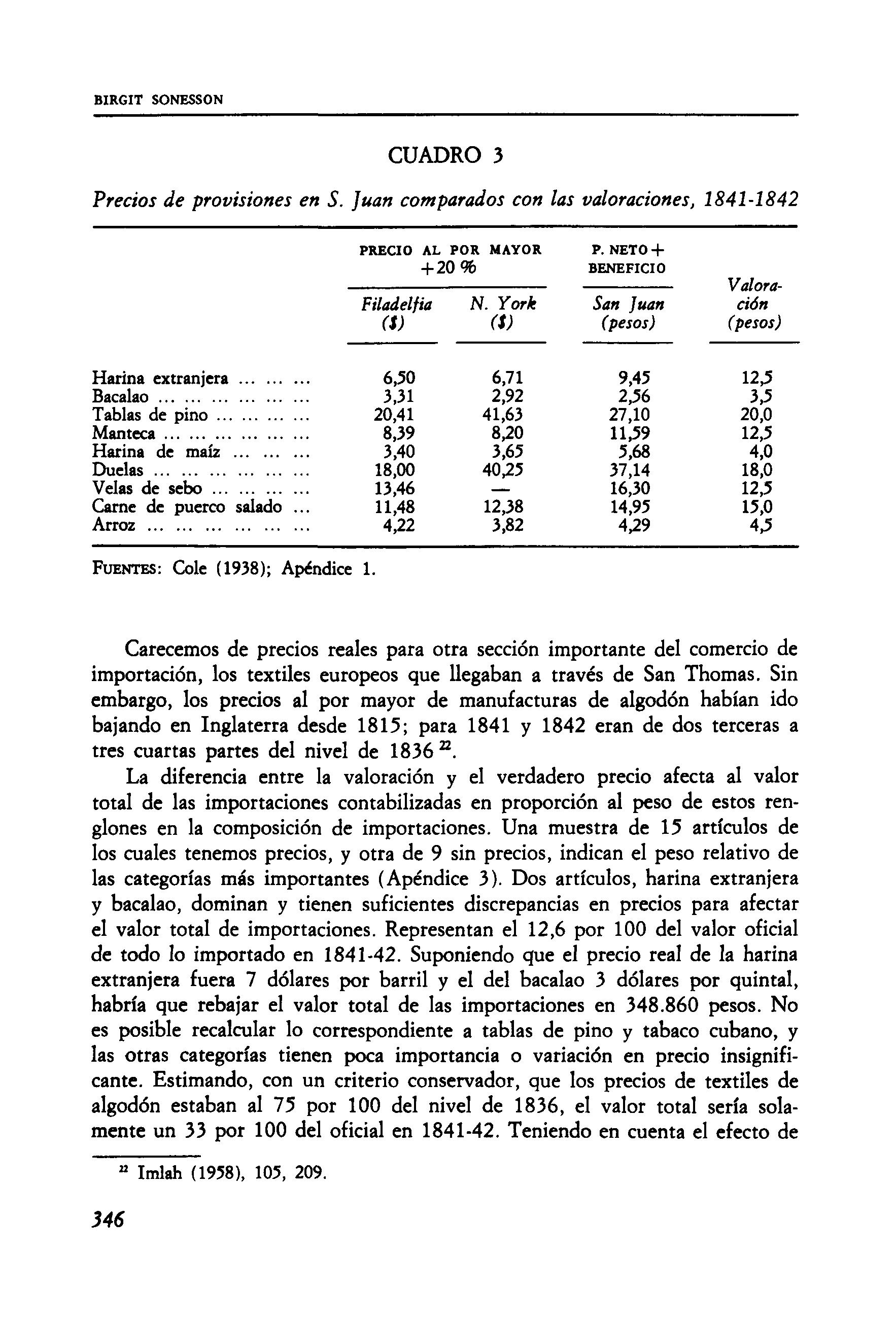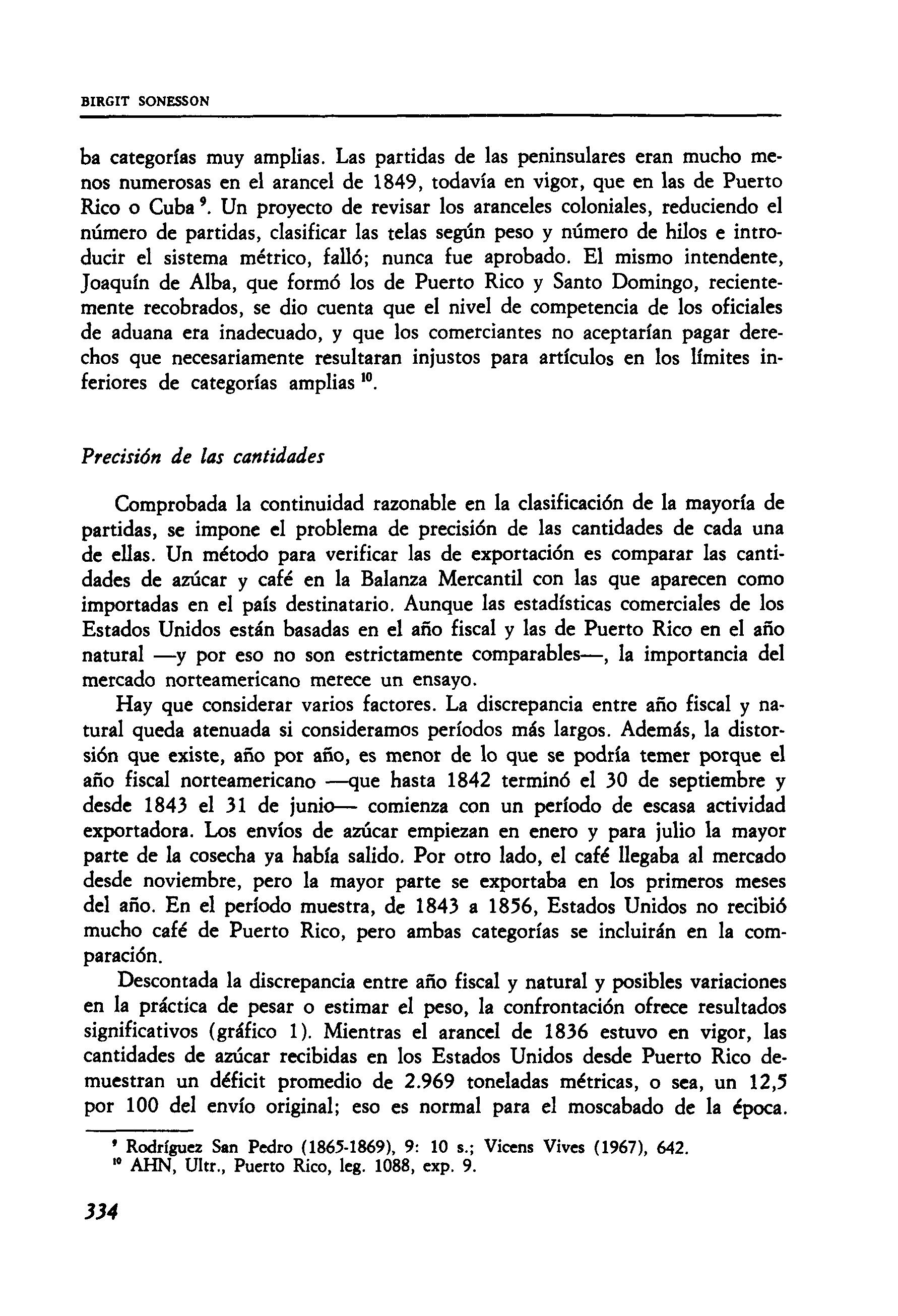 En los primeros años, mientras las decisiones todavía se tomaban en la isla, las Balanzas respondieron a condiciones y requisitos locales. Las de 1829 y 1833 tenían alrededor de setenta categorías de importación; solamente fijan el valor total de cada una, no la cantidad. Algunas categorías, como «alimentos», son muy amplias; «caldos» incluyen vinos, bebidas alcohólicas y aceite de comida. Hay cinco clases de «mercancía»: de algodón, hilo, lana, seda y mezclas con algodón o hilo. Para 1833, «alimentos», harina de trigo y de to, continuaba su clasificación y métodos de valoración independientes. AHN, Ultr., leg. 1088, exp. 9; Moreno Fraginals (1978), 3: 7-32. Las páginas que siguen se limitan al examen de la fiabilidad de las estadísticas; para cuestiones de sustancia en el comercio entre España y Puerto Rico, véase Sonesson (1985).