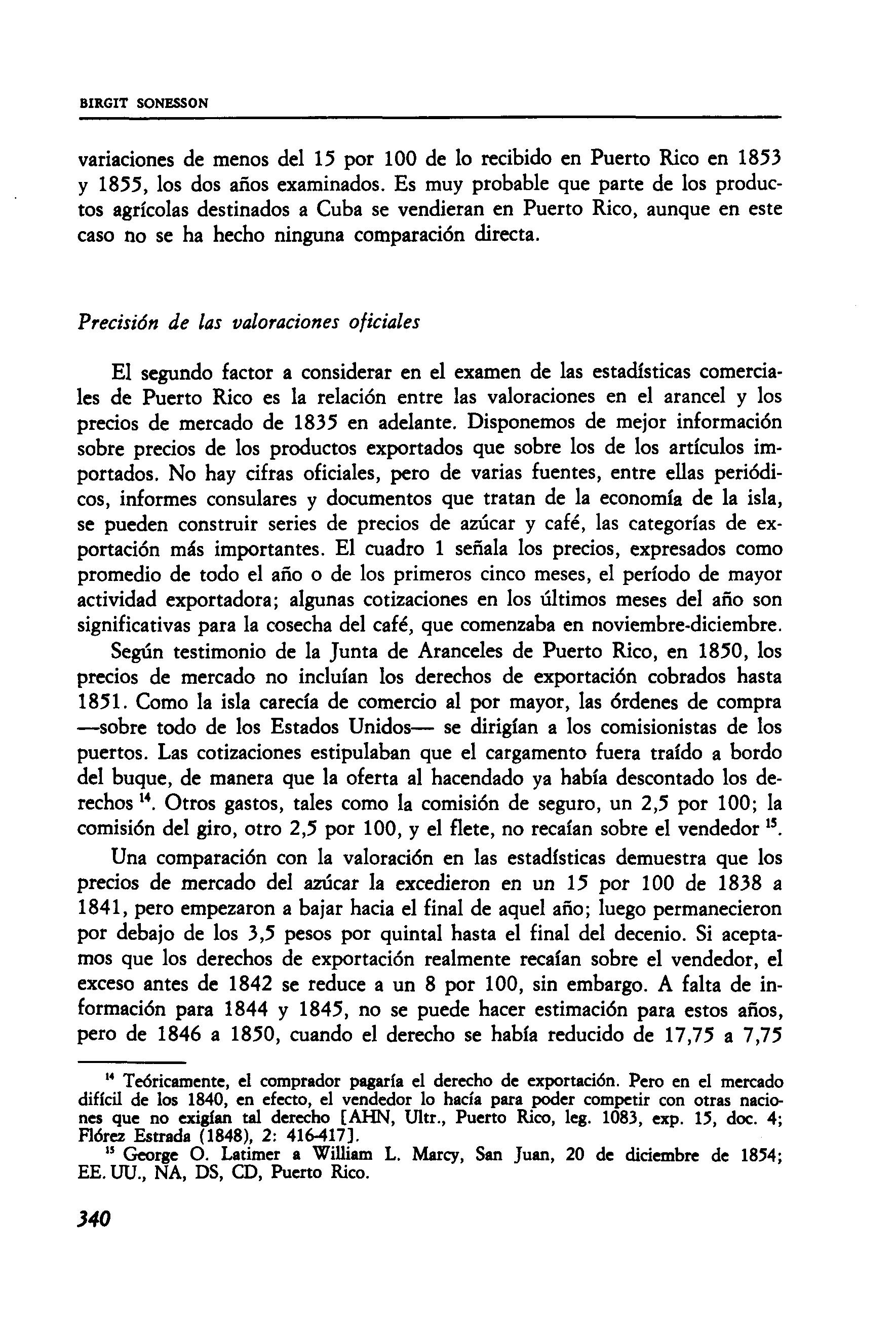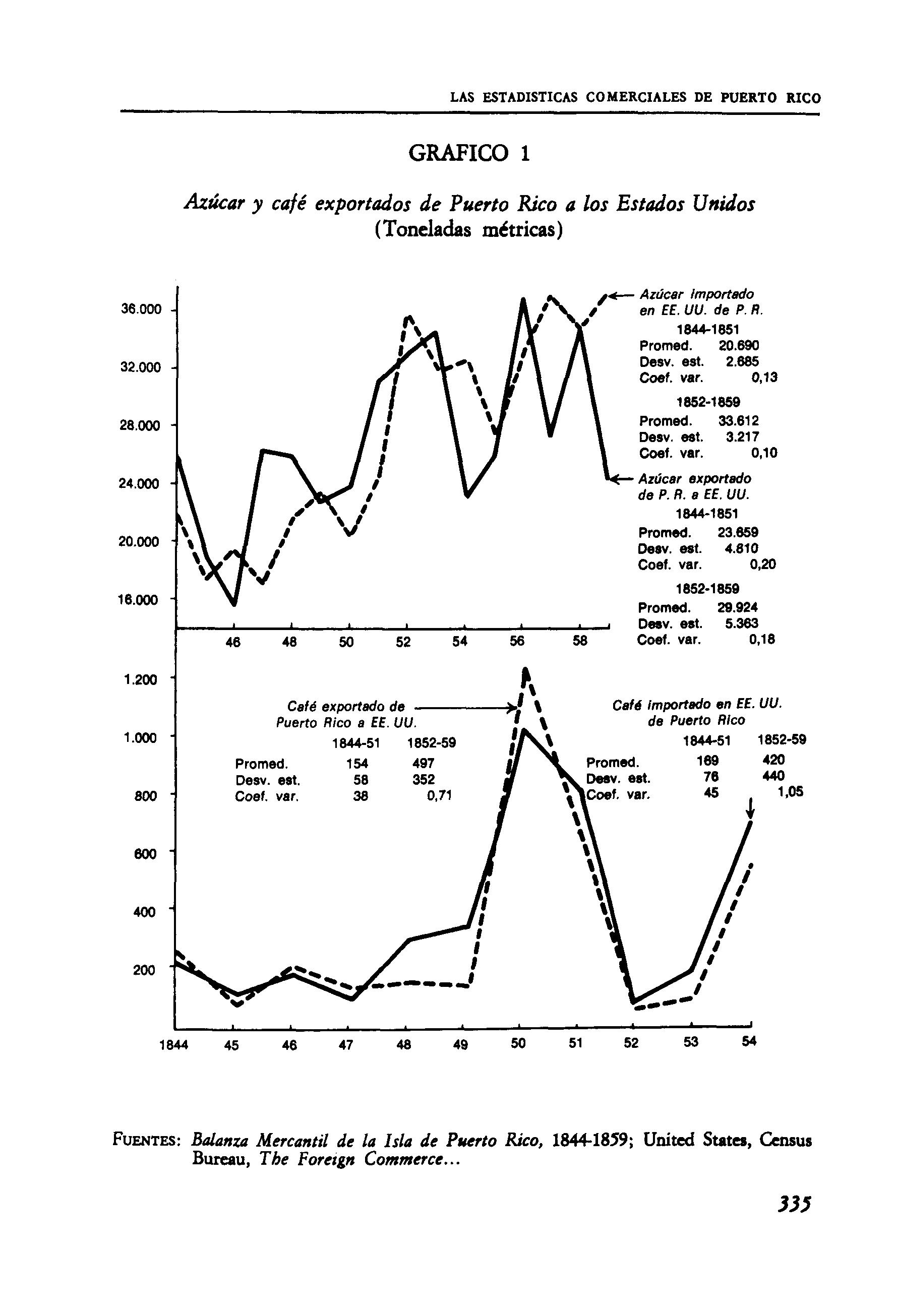 Eliminados los derechos de exportación de Puerto Rico en noviembre de 1851, las estadísticas norteamericanas exhiben cantidades recibidas que son mucho mayores que las exportadas de la isla, un promedio del 10,9 por 100 de lo recibido entre 1852 y 1859. Esto es difícil de explicar a menos que las cifras de la Balanza Mercantil excluyan parte de los cargamentos, una vez que los oficiales de aduana no tenían que cobrar derechos Los comentarios de los cónsules de Francia e Inglaterra apoyan tal conclusión. La correspondiente confrontación de las estadísticas del café también indica que la obligación de cobrar derechos resultaba en estadísticas más precisas. Entre 1844 y 1847, el café recibido sobrepasó lo exportado con un promedio del 9,2 por 100, nada sorprendente si consideramos que los envíos comenzaron en diciembre y que probablemente hubo demoras en las cuentas. De 1848 a 1854 hubo un déficit del 15,6 por 100, sin embargo. El café no pierde peso en camino, como el azúcar, y debemos atribuir la discrepancia al descuido por parte de los oficiales norteamericanos, una vez que el arancel Walker eliminó los derechos de importación sobre café y té al final de 1847.