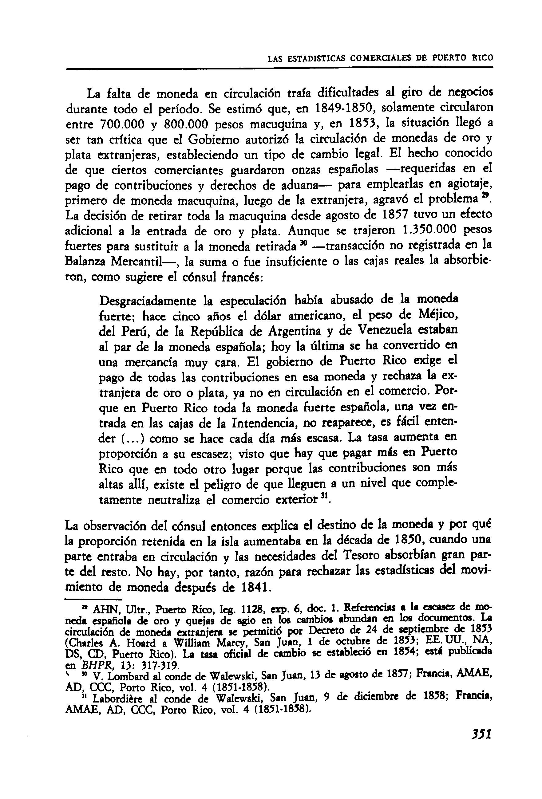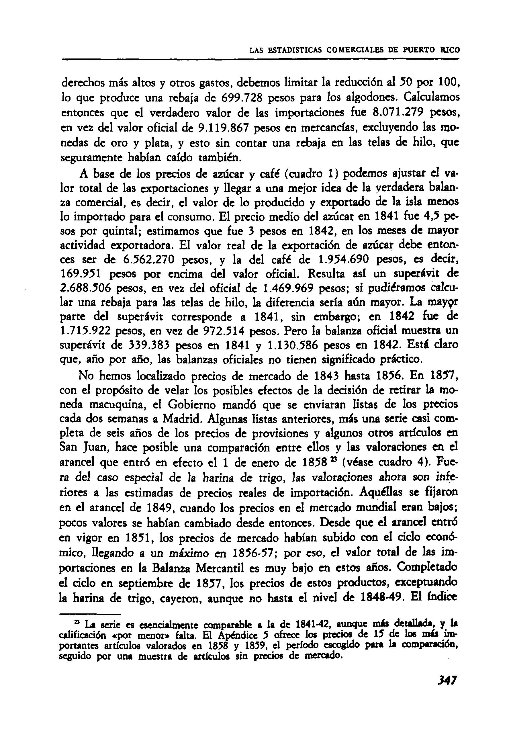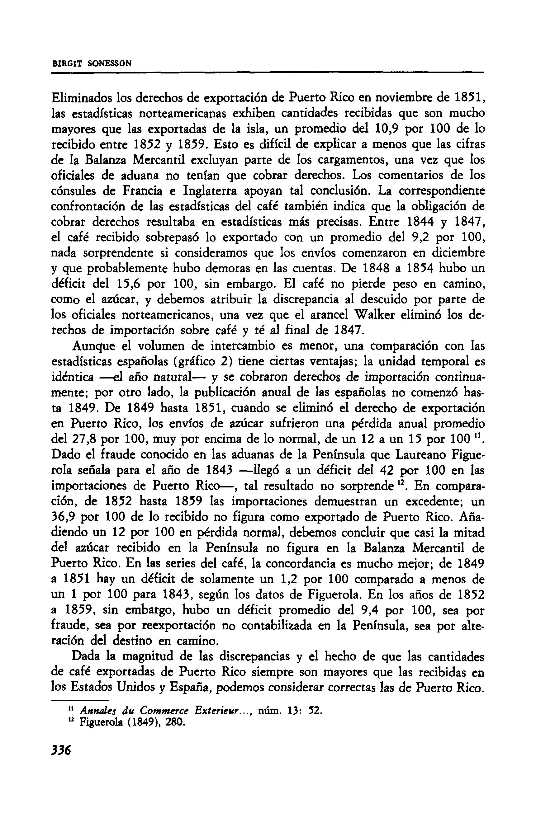 Dado el fraude conocido en las aduanas de la Península que Laureano Figuerola señala para el año de 1843 —llegó a un déficit del 42 por 100 en las importaciones de Puerto Rico—, tal resultado no sorprende ". En comparación, de 1852 hasta 1859 las importaciones demuestran un excedente; un 36,9 por 100 de lo recibido no figura como exportado de Puerto Rico. Añadiendo un 12 por 100 en pérdida normal, debemos concluir que casi la mitad del azúcar recibido en la Península no figura en la Balanza Mercantil de Puerto Rico En las series del café, la concordancia es mucho mejor; de 1849 a 1851 hay un déficit de solamente un 1,2 por 100 comparado a menos de un 1 por 100 para 1843, según los datos de Figuerola. En los años de 1852 a 1859, sin embargo, hubo un déficit promedio del 9,4 por 100, sea por fraude, sea por reexportación no contabilizada en la Península, sea por alteración del destino en camino.