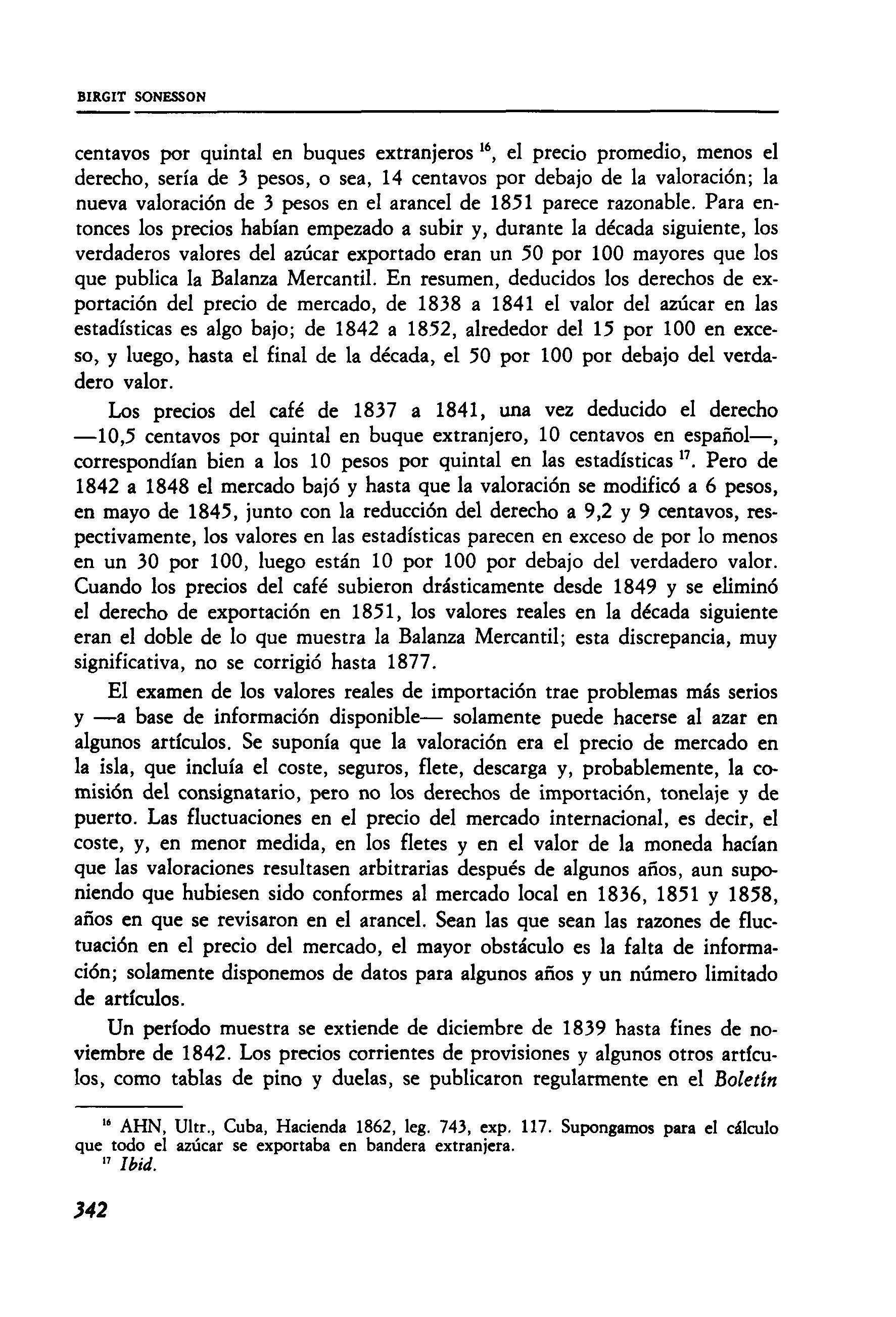 Las formalidades de aduana eran complejas y flexibles, según variaban los precios corrientes en la plaza y las exigencias de las cajas provinciales En cada aduana y receptoría se cobraban 17 derechos distintos a la importación y 8 a la exportación. La clasificación de los géneros exportados se modificaba al paso de los cambios en precio y calidad. Por ejemplo, en 1833, azúcar se dividió en tres categorías, valoradas a 7, 4 y 1,5 pesos por quintal, en vez de la única clase anterior, valorada a 4 pesos Como la mayor parte de la producción era de calidad inferior, en efecto, los derechos quedaron reducidos al par de la caída de precios en el mercado internacional; pero los ingresos cayeron a la mitad de los de 1829. Los precios del café habían subido en 1832 y 1833 y, aumentado el valor fijo de los cinco mejores tipos, lograron cubrir parte del déficit producido por el azúcar'. Esa libertad amplia que gozaron las autoridades locales terminó en 1836, cuando los valores fijos en el arancel de 1835 subieron, según orden de Madrid. Luego casi no se cambiaron, a pesar de una provisión de 1851 de revisarlos semianualmente