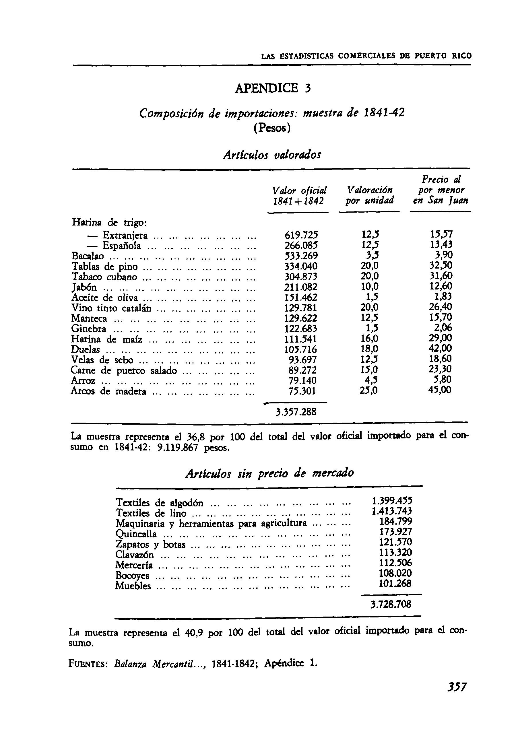 La muestra representa el 36,8 por 100 del total del valor oficial importado para el consumo en 1841-42: 9.119.867 pesos
