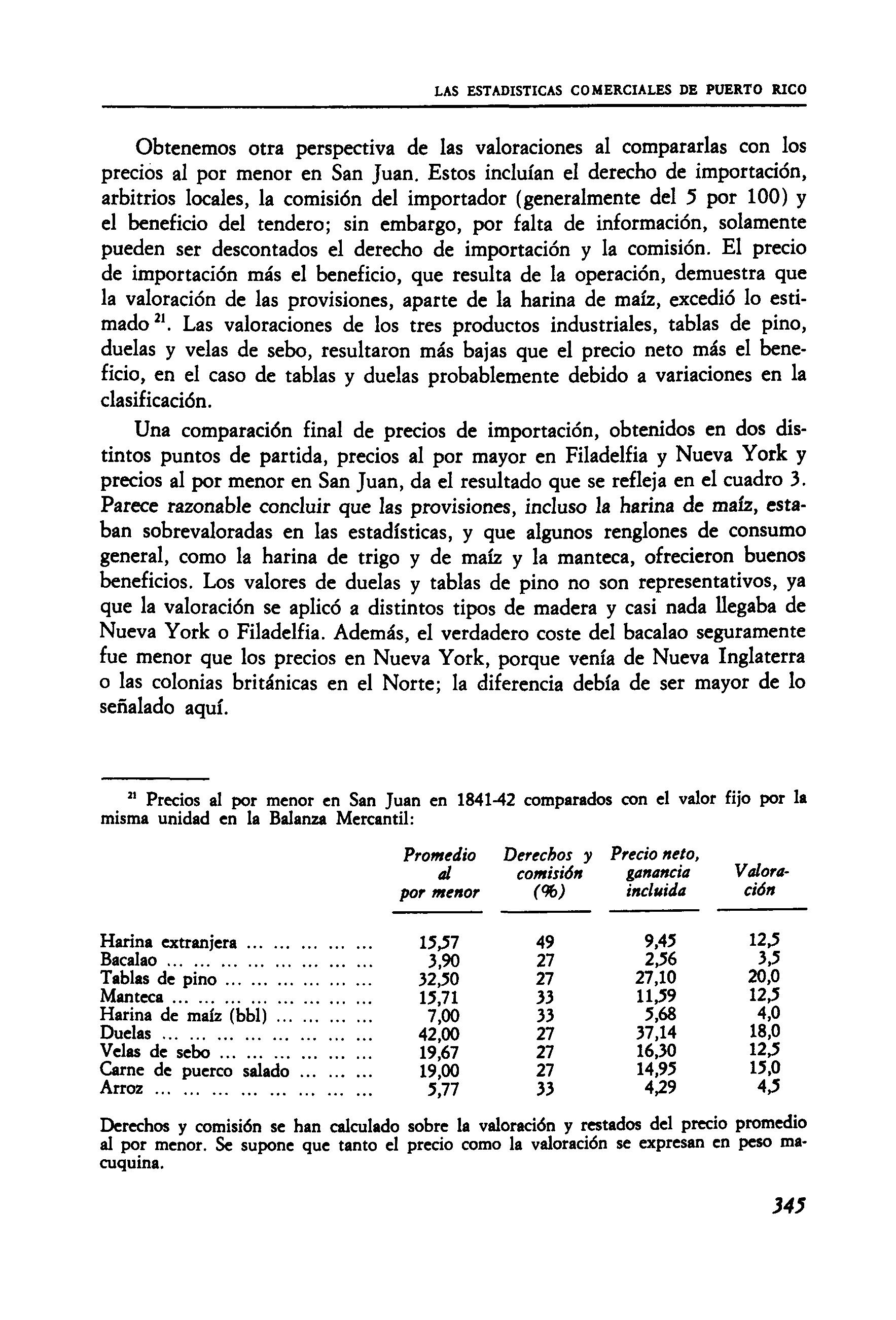 Los métodos de clasificación y valoración siempre han sido objeto de controversia en la formación e interpretación de estadísucas comerciales. Los sistemas varían de un país a otro, aun entre España peninsular y sus colonias. En Puerto Rico, la clasificación correspondía a las partidas del arancel hasta 1860, agrupadas según hemos indicado Quiere decir que de 1843 en adelante las listas de importación son muy detalladas. El arancel de 1835 comprendió 2.599 partidas de importación y 103 de exportación; para 1857 eran 3.754 y 80, respectivamente, y un apéndice extraoficial de otras 563 partidas de importación se había añadido para 1864' En la Balanza Mercantil la lista de importaciones crecía al paso de que la variedad de artículos importados aumentaba; en 1845 hubo 530; en 1856, 710, y en 1860, 853 artículos. El grupo de «otros artículos» había aumentado a 331, comparado a 168 de víveres y 354 de manufacturas; la clasificación introducida por Del VaUe en 1838 había perdido su significado.