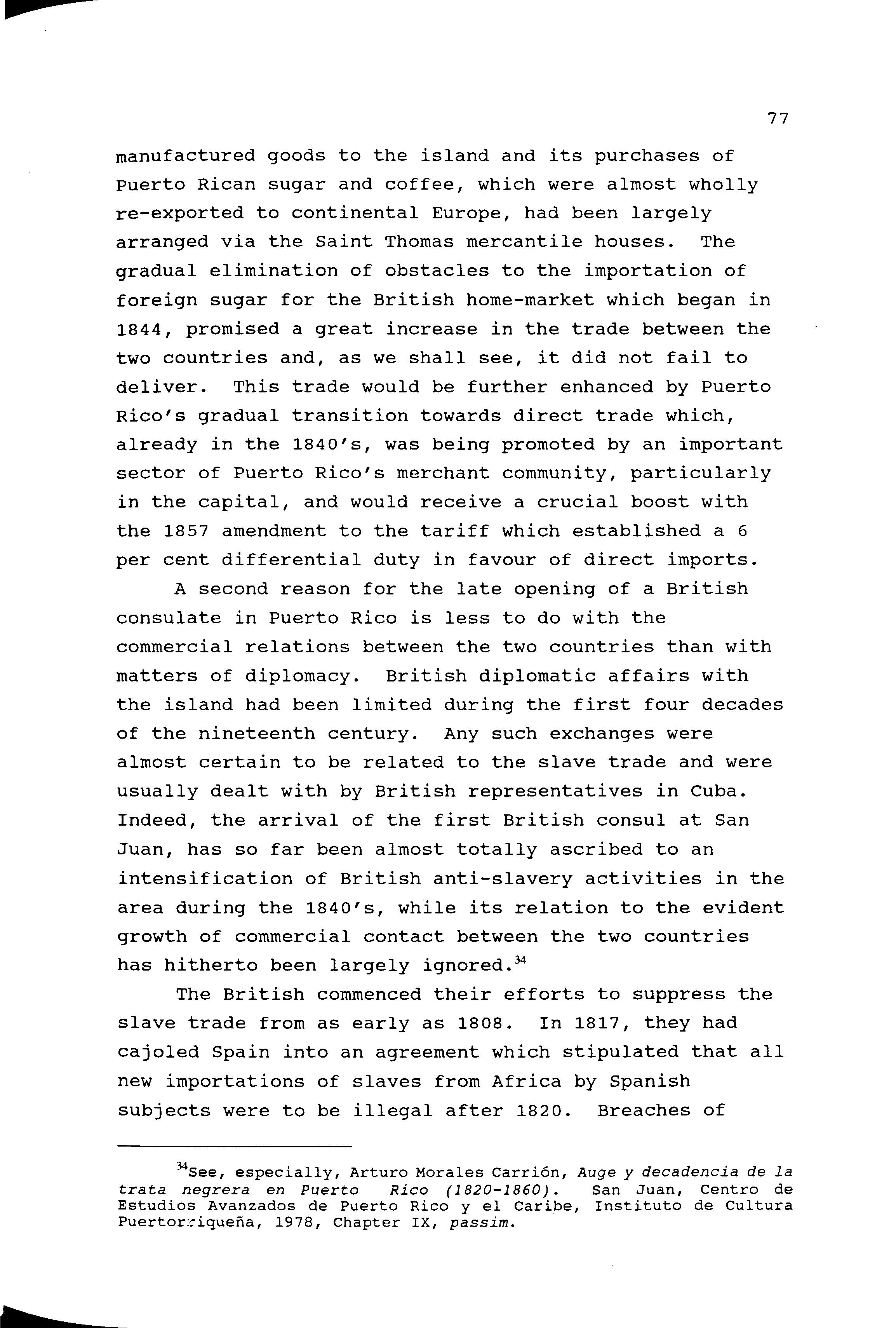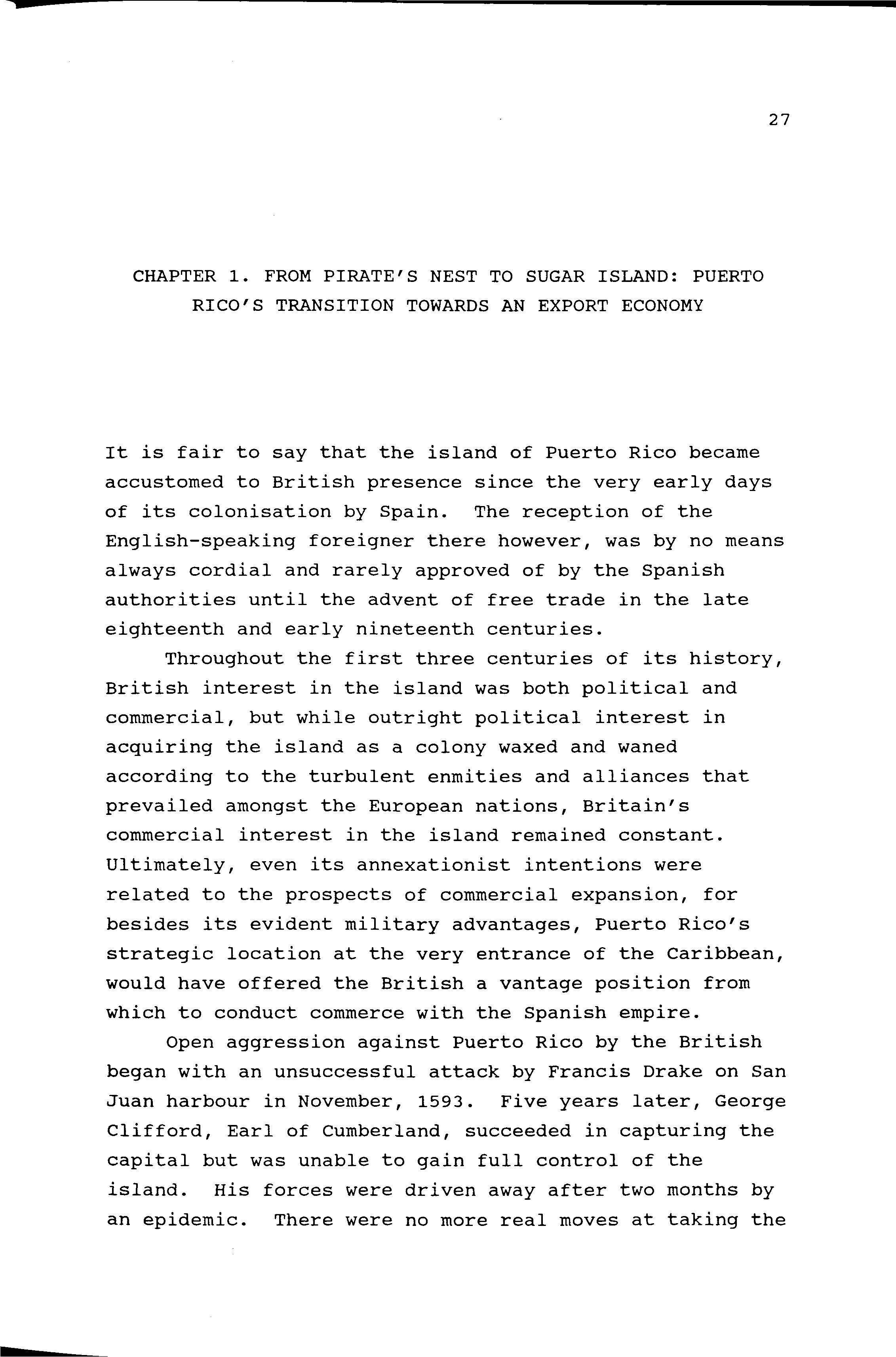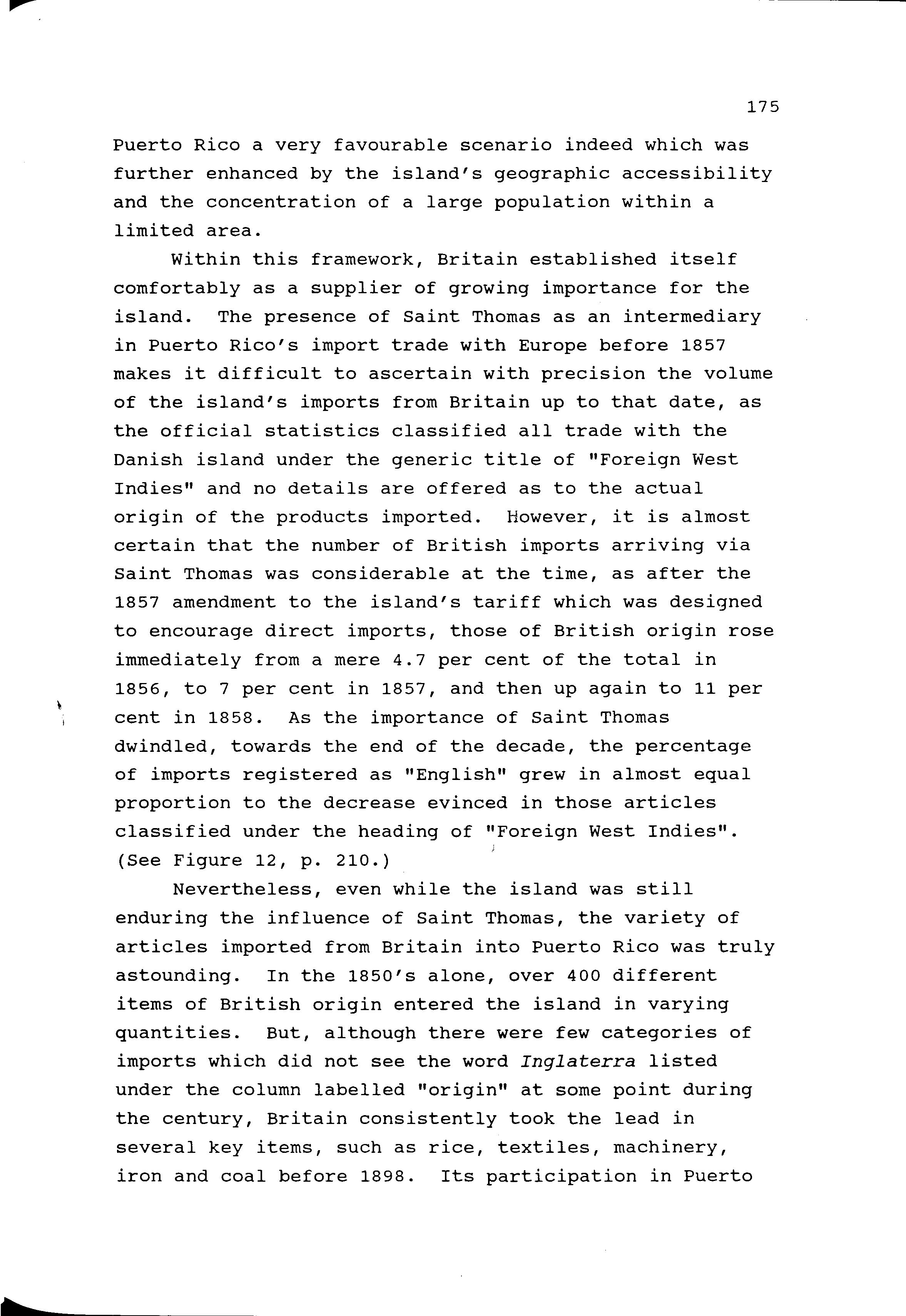 which Puerto Rico once shared with Great Britain, I may help to dispel some of the indifference which the island's present isolation has promoted abroad. But much more importantly, it might strike a chord of surprise, or perhaps even familiarity, amongst a people who have become so accustomed to regarding themselves as powerless before fate and the incumbent metropolis, to realise that that same "small tropical island, densely populated [and] poor in natural resources"17 , once carried out an "immense British commerce" in spite of its status as a Spanish colony and in spite of the proximity of its powerful American neighbour.