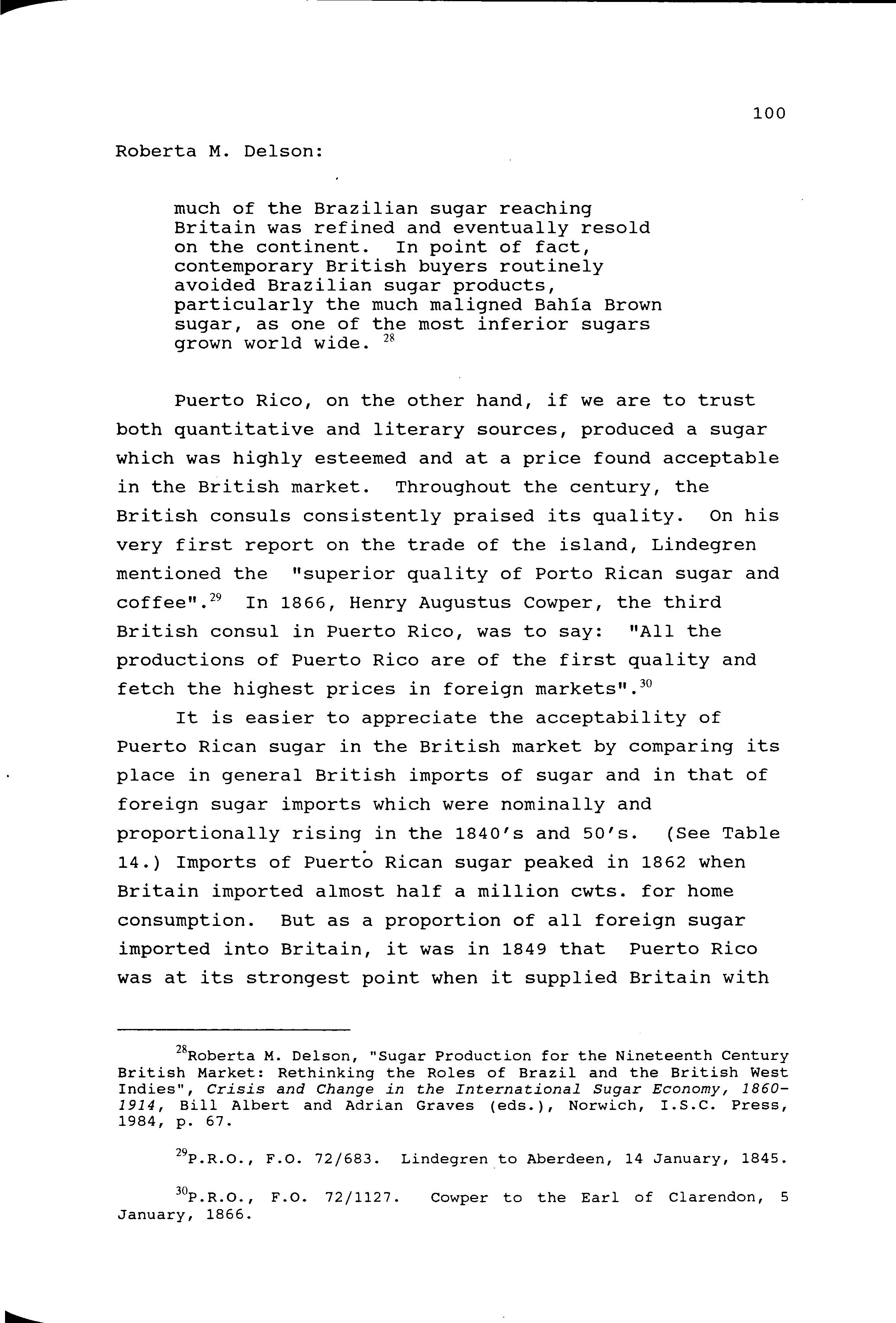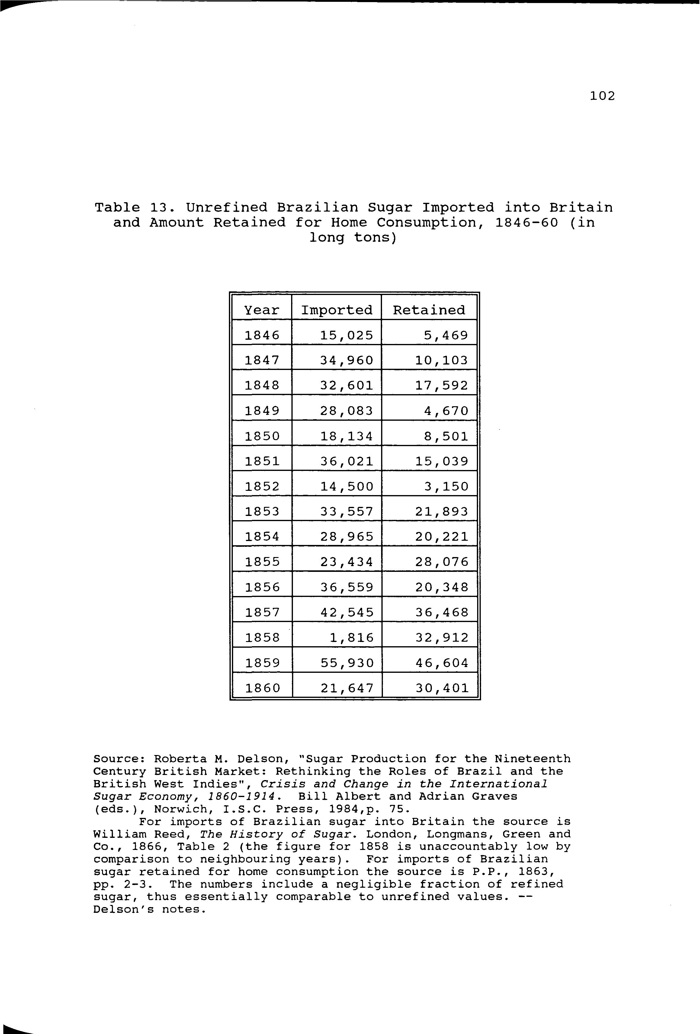 DELSON, Roberta M., "Sugar Production for the Nineteenth Century British Market: Rethinking the Roles of Brazil and the British West Indies", in Bill Albert and Adrian Graves (eds.) Crisis and Change in the International Sugar Economy, 1860-1914. Norwich, I.S.C. Press, 1984.