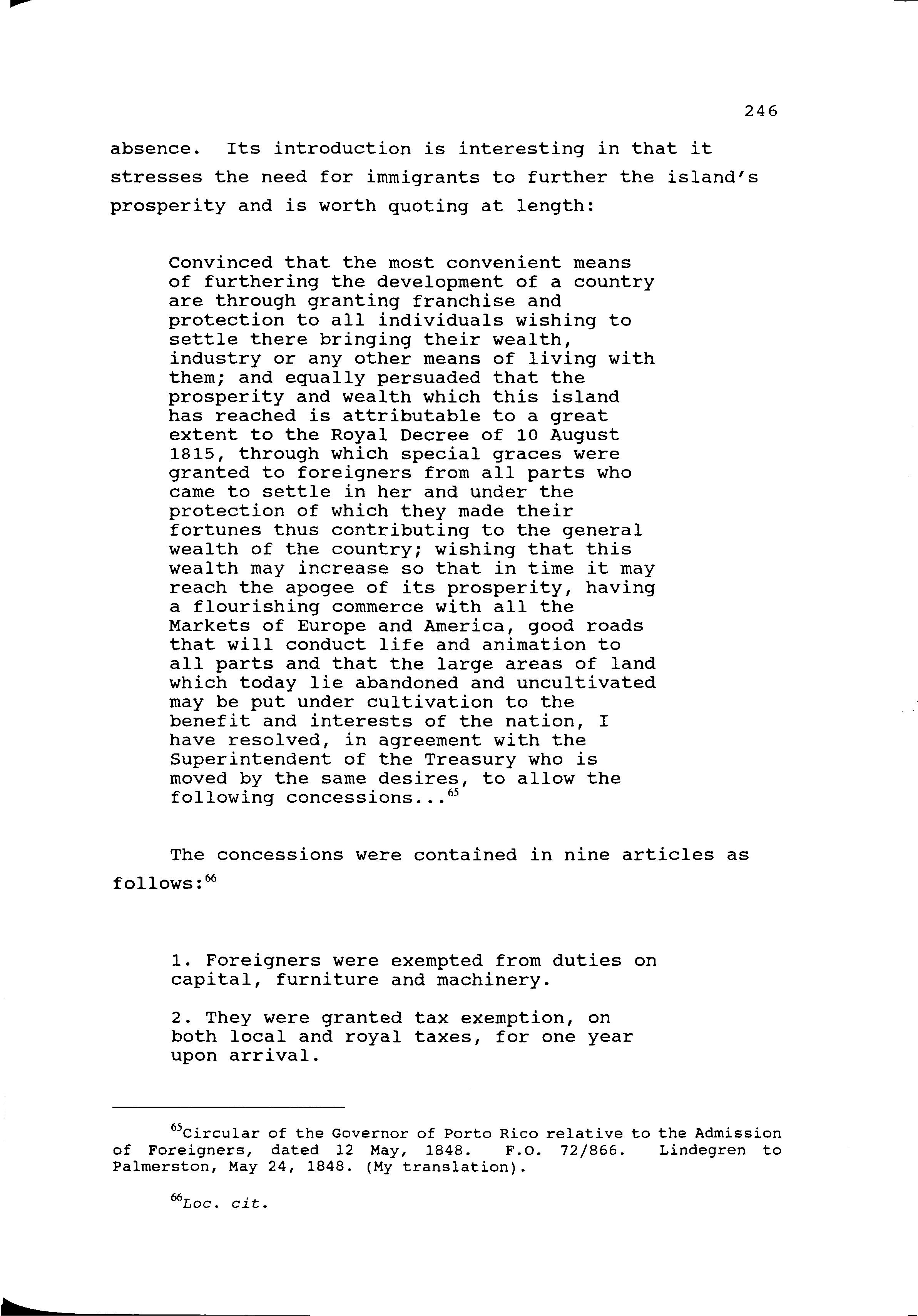 attempt was made to analyse Puerto Rico's general commercial relations during a significant portion of the nineteenth century. Sonesson's work concentrates on the period between 1835 and 1865, placing considerable stress on Spanish commercial and fiscal policy with respect to Puerto Rico. It is particularly useful in its detailed description of the development of the island's tariff structure and the influence of Saint Thomas in its commercial affairs which was at its hight during the greater part of the period she examines.6