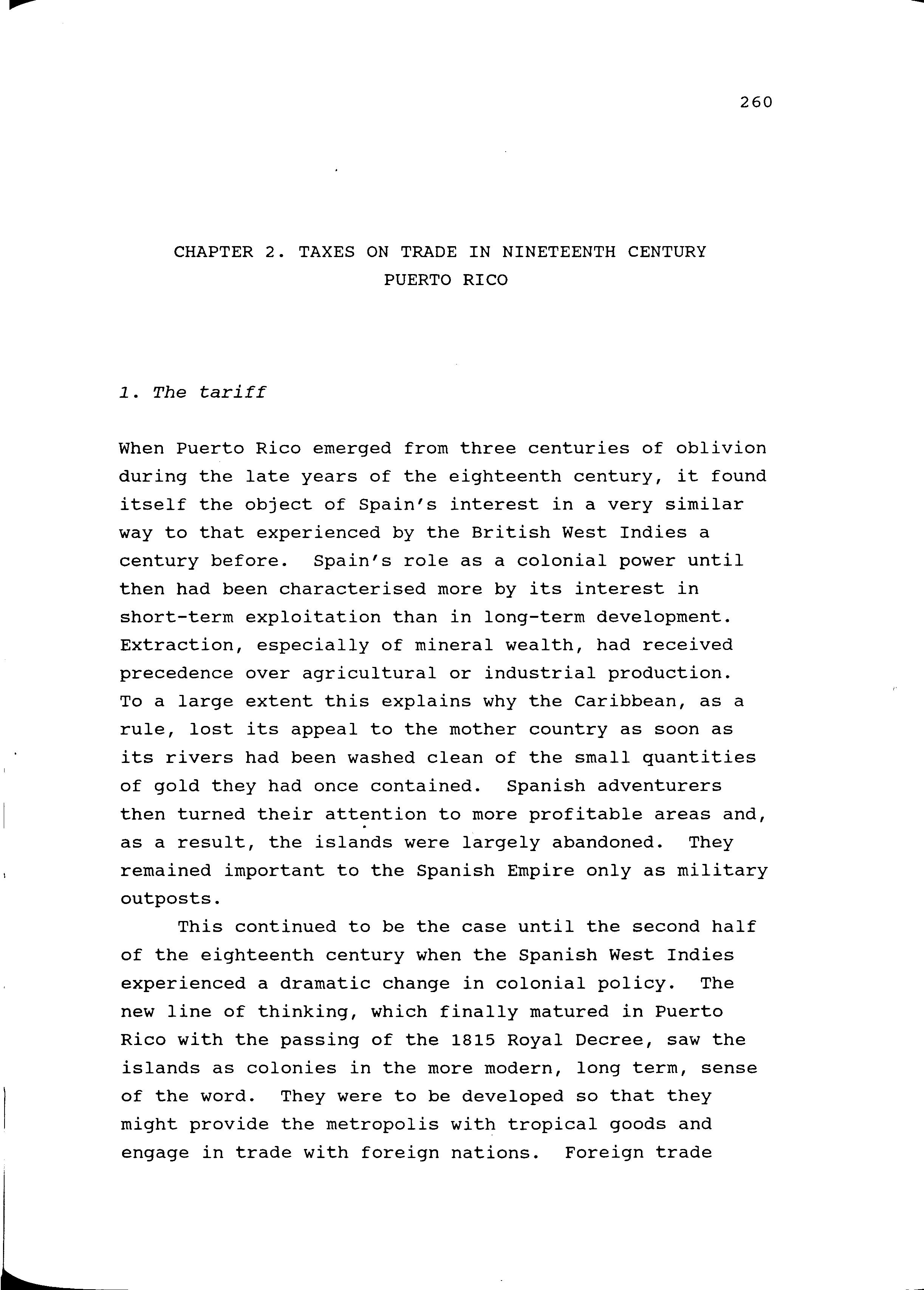 Needless to say, there are large areas concerning the history of Puerto Rico's external trade which are as yet un-examined. This relative vacuum is, to say the least unfortunate. A lack of familiarity with the subject can significantly alter the perspective on a wide variety of seemingly unrelated issues. After all, the Puerto Rican economy during the nineteenth century was primarily export-oriented and an understanding of the mechanisms of its exterior trade must be a crucial prerequisite for an accurate comprehension of it society, its politics, and the internal workings of its economy. This essay attempts to shed some light on this important, yet largely unexplored area of our history.