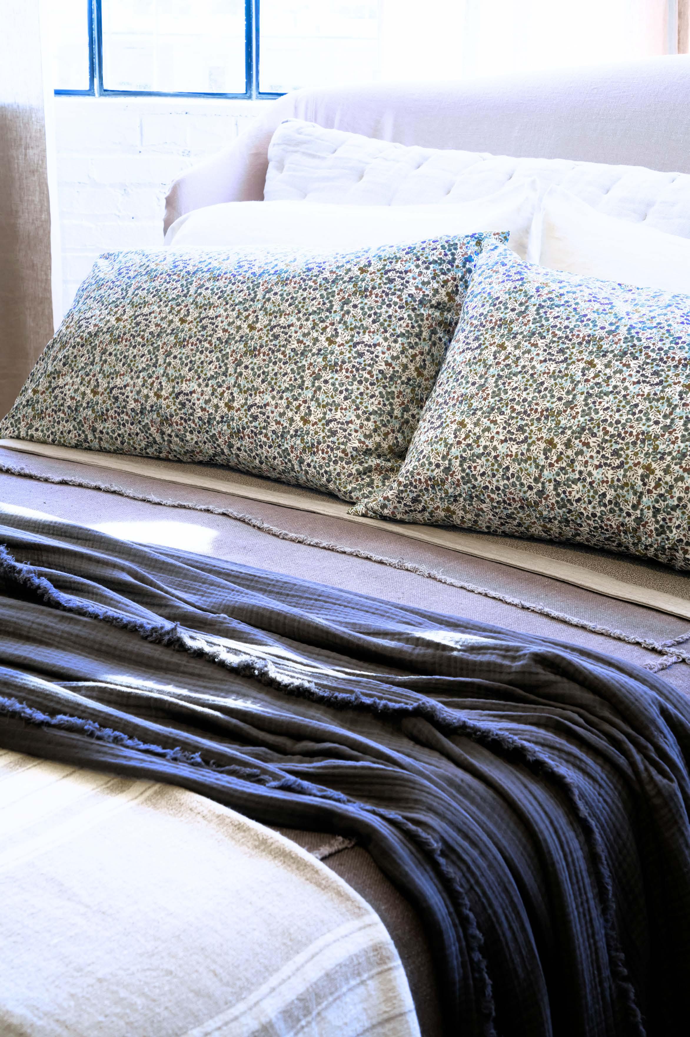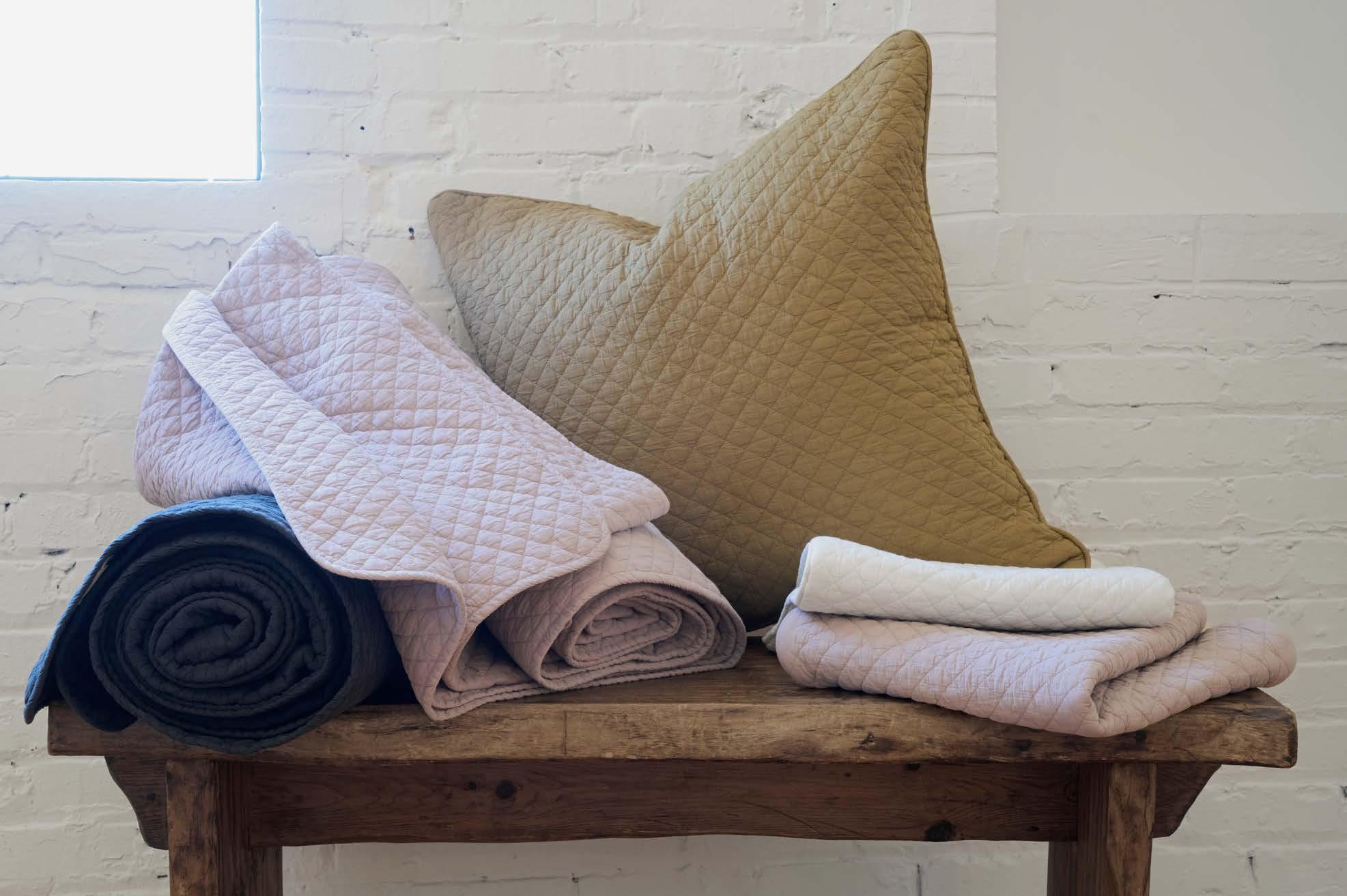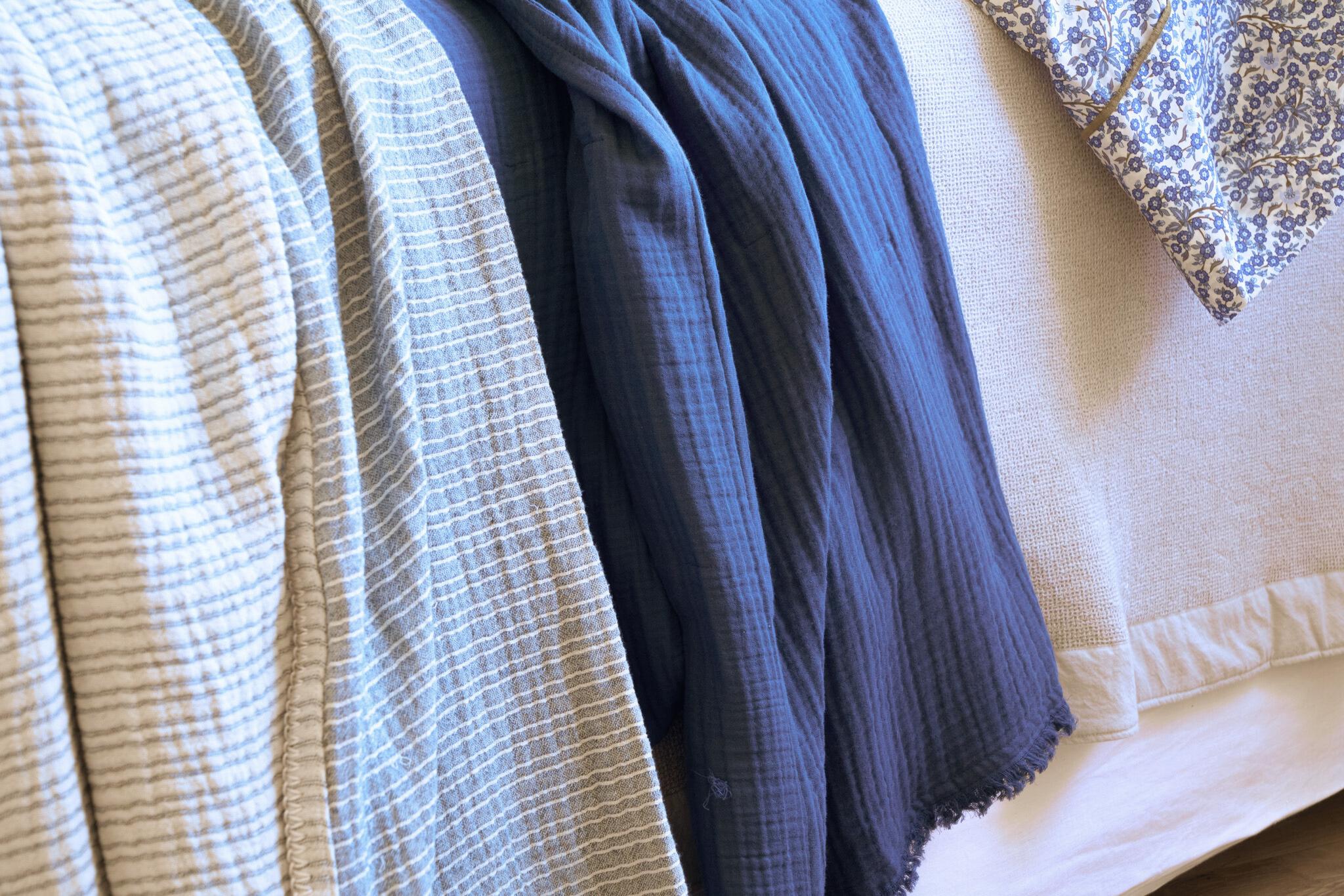 FEATURED: Twine Coverlet, Lizzy Blanket in Delph Blue, and Tilly Coverlet in Oatmeal.
